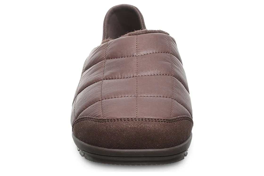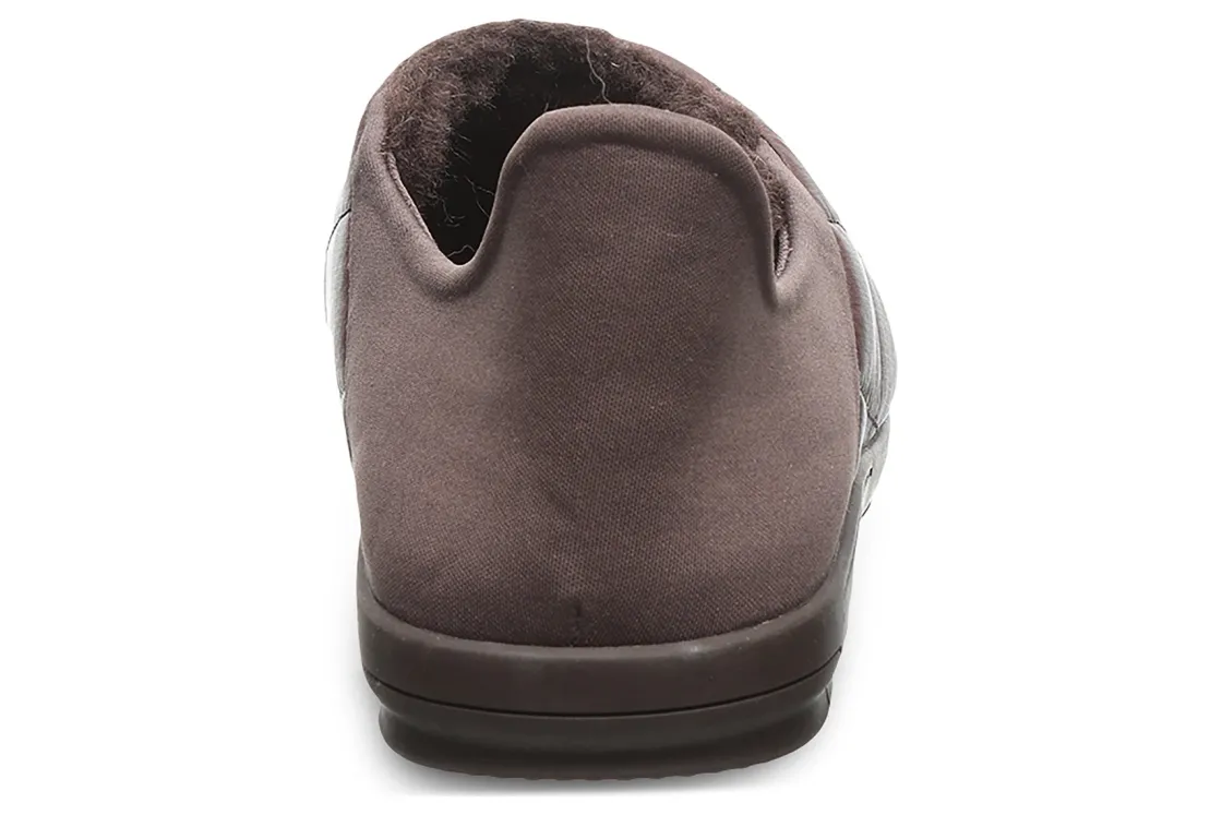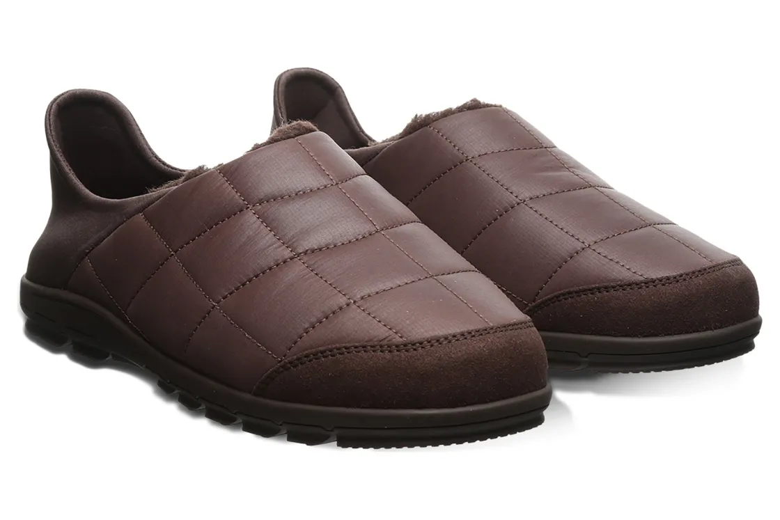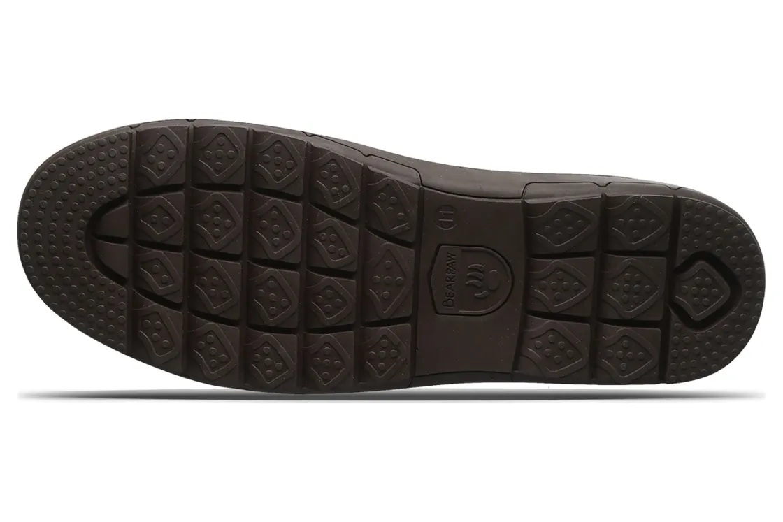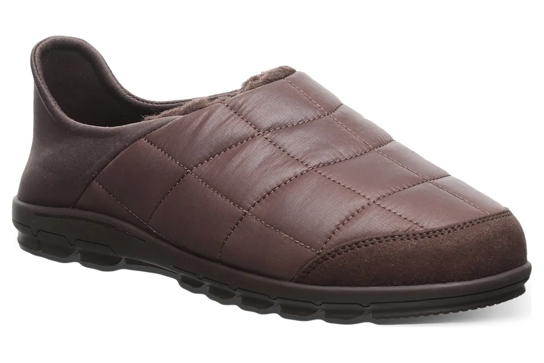 Bearpaw Harry is a nylon slipper for cold days. These slippers have quilted nylon uppers, neoprene heel backing, comfort sheepskin footbed and rubber outsole. A wool lining, round toe, slip-on construction and 1-inch platform height outlines these reliable slippers.