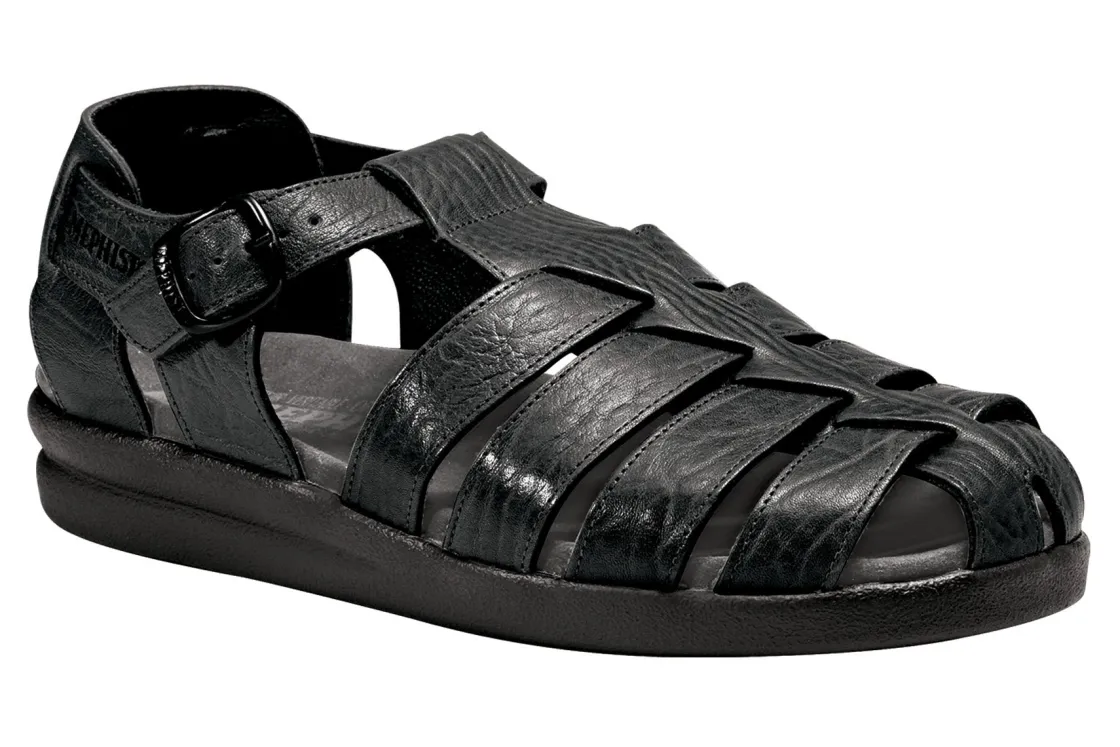 Easy to slip on and very comfortable, this sandal will satisfy all your daily needs. The SOFT-AIR midsole and SHOCK-ABSORBER help to minimize the impact for an effortless walk with a spring in your step. The AIR-RELAX technology respects the anatomy of the foot to prevent fallen arches. Its adjustable, functional strap has a buckle fastening for added ease. MEPHISTO SAM | Men Sandals Black Leather Crumpled Effect