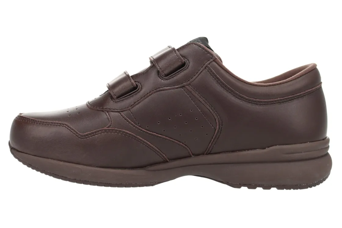 Propet Lifewalker Strap is a supportive men’s walking shoe. Features include leather uppers, adjustable straps, a removable footbed and a sturdy rubber outsole. A high-density Open Cell PU foam provides arch support and a breathable nylon lining keeps feet cool.