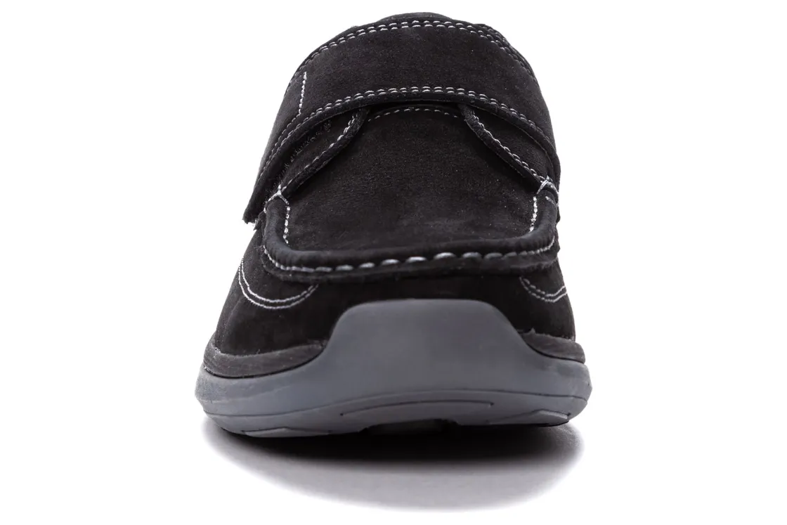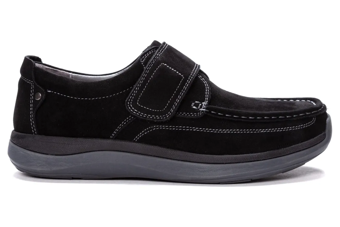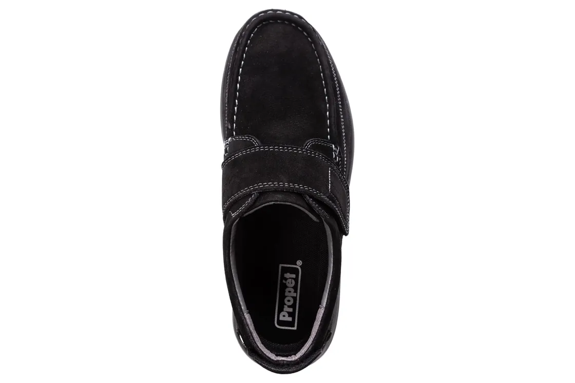 Propet Porter is a sturdy shoe with traditional moc styling. Features include a nubuck upper, mesh lining, removable footbed, open cell insole and EVA outsole. A hook and loop strap closure secures feet and a 1-inch platform heel elevates these stylish loafers.