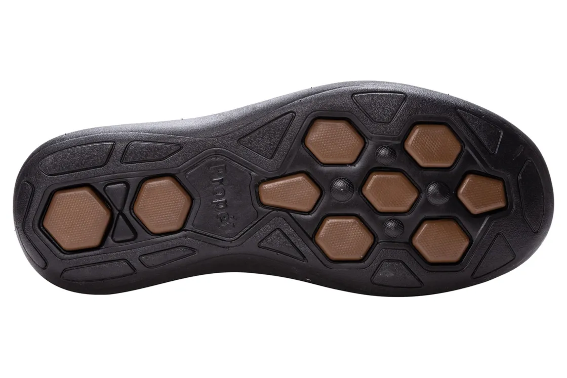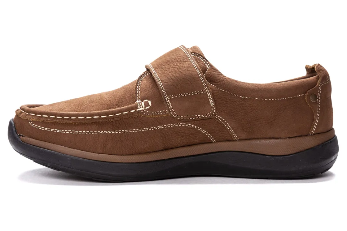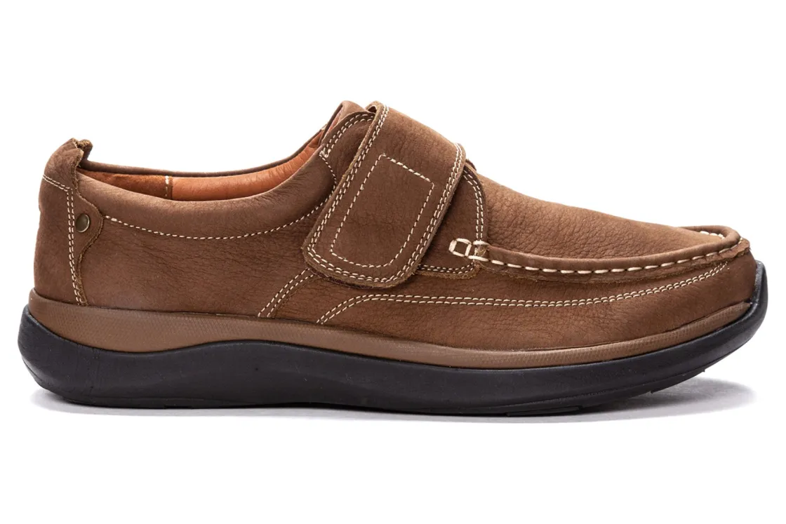 Propet Porter is a sturdy shoe with traditional moc styling. Features include a nubuck upper, mesh lining, removable footbed, open cell insole and EVA outsole. A hook and loop strap closure secures feet and a 1-inch platform heel elevates these stylish loafers.