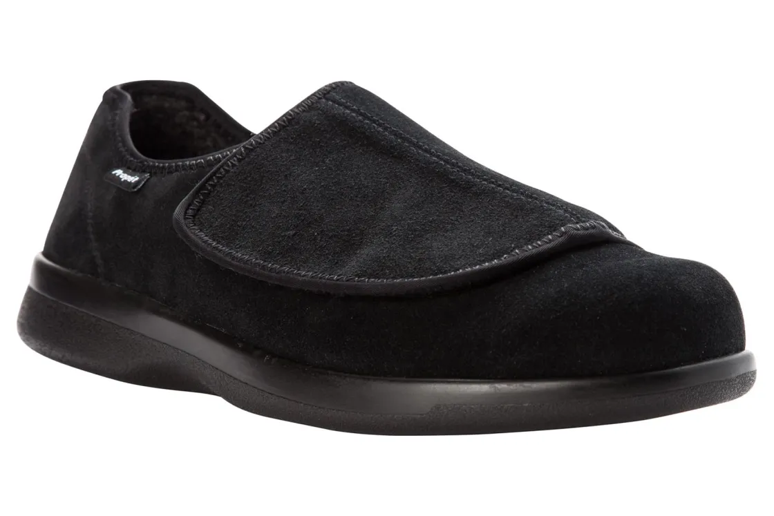 Whether you’re indoors or outdoors, stride in ultimate comfort in the men’s Propet Coleman slipper. The suede upper features an extra-large hook and loop closure to ensure a secure and personalized fit. The cushioned terry cloth footbed is easily removed to accommodate a custom orthotic, while the durable polyurethane outsole provides stability and traction on both indoor and outdoor surfaces.