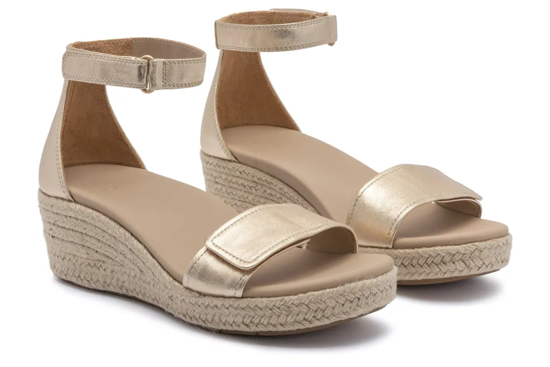 The ABEO Riviera Ankle Sandal provides arch support, natural cushioning, and an eco-friendly aesthetic appeal. Sporting the appearance of a clever flatform sandal that combines the height of a platform sandal with a flatter built-in orthotics, it promotes proper foot alignment and helps reduce pain and fatigue while walking. This wedge sandal was formerly called Cecile.