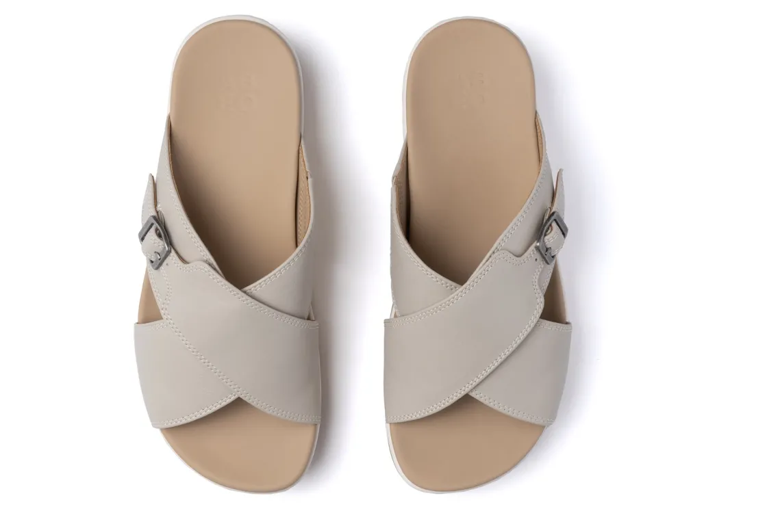 The ABEO Solstice Cross Slide, a clever flatform sandal design that combines the height of a platform sandal with the comfort of a flatter footbed with exceptional orthotic support. This wedge sandal features soft leather uppers with an adjustable closure and different midsole options like EVA foam, cork, and jute wraps providing freedom to choose what works best for your feet. This buckle sandal was formerly called Dylan.
