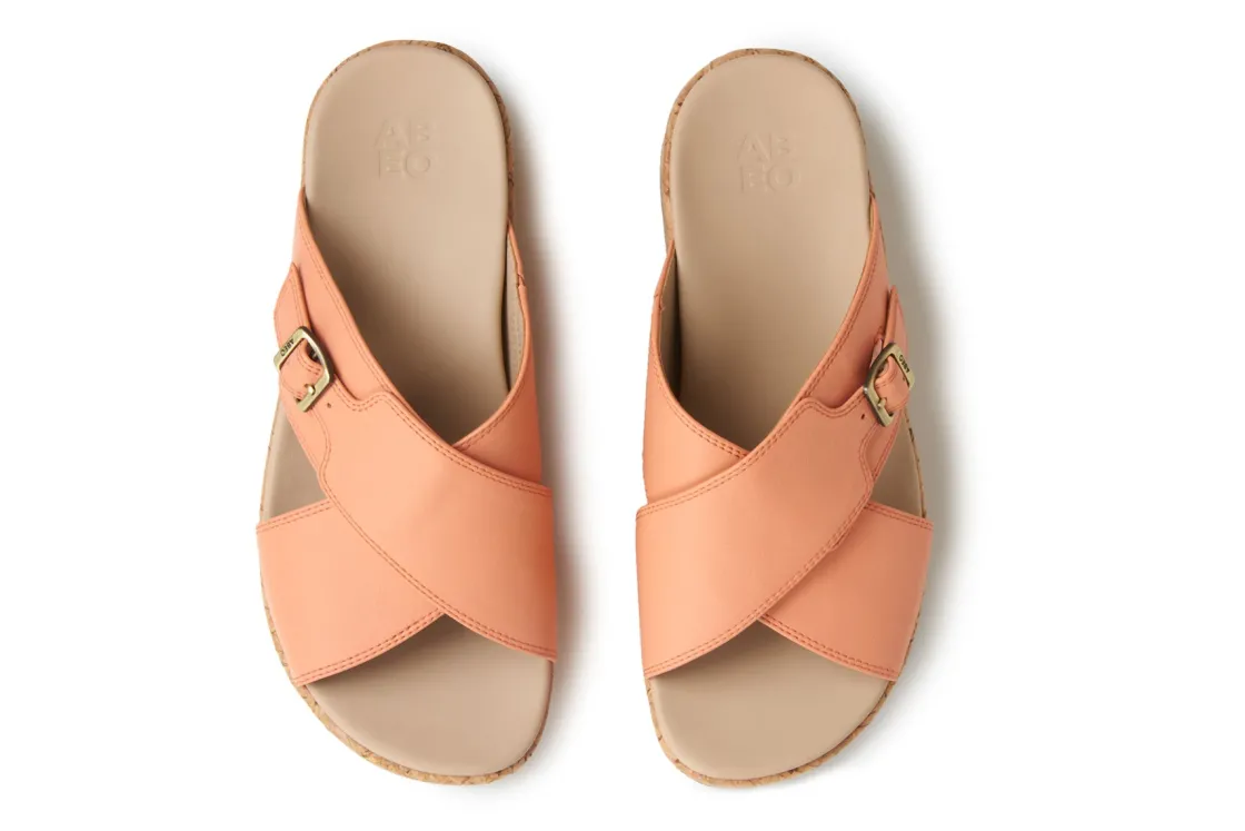 The ABEO Solstice Cross Slide, a clever flatform sandal design that combines the height of a platform sandal with the comfort of a flatter footbed with exceptional orthotic support. This wedge sandal features soft leather uppers with an adjustable closure and different midsole options like EVA foam, cork, and jute wraps providing freedom to choose what works best for your feet. This buckle sandal was formerly called Dylan.