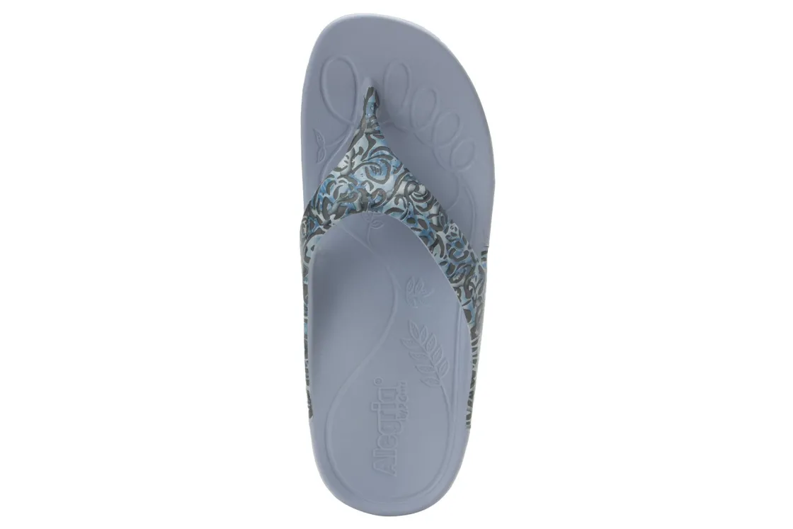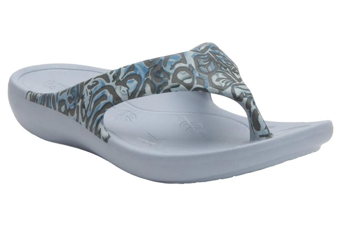 Alegria Ode is a toe post sandal for warm weather days. These recovery sandals have a one-piece EVA construction, built-in molded arch support and EVA outsole. A contoured footbed adds comfort, while a rocker outsole helps to relieve tension.
