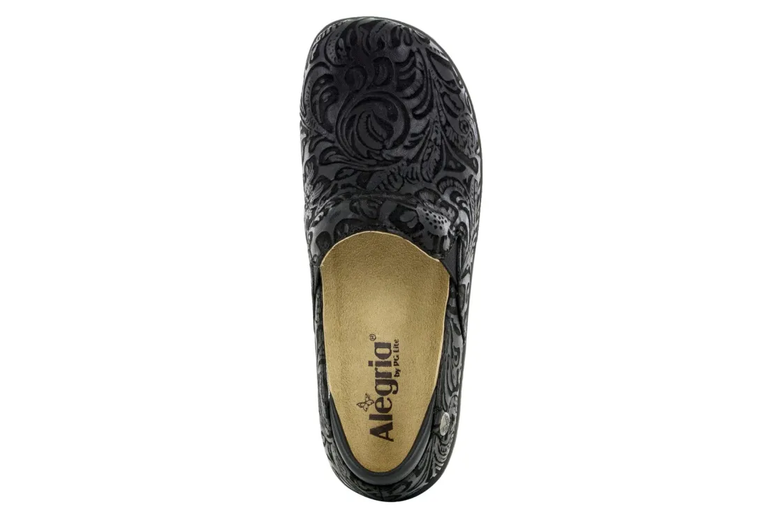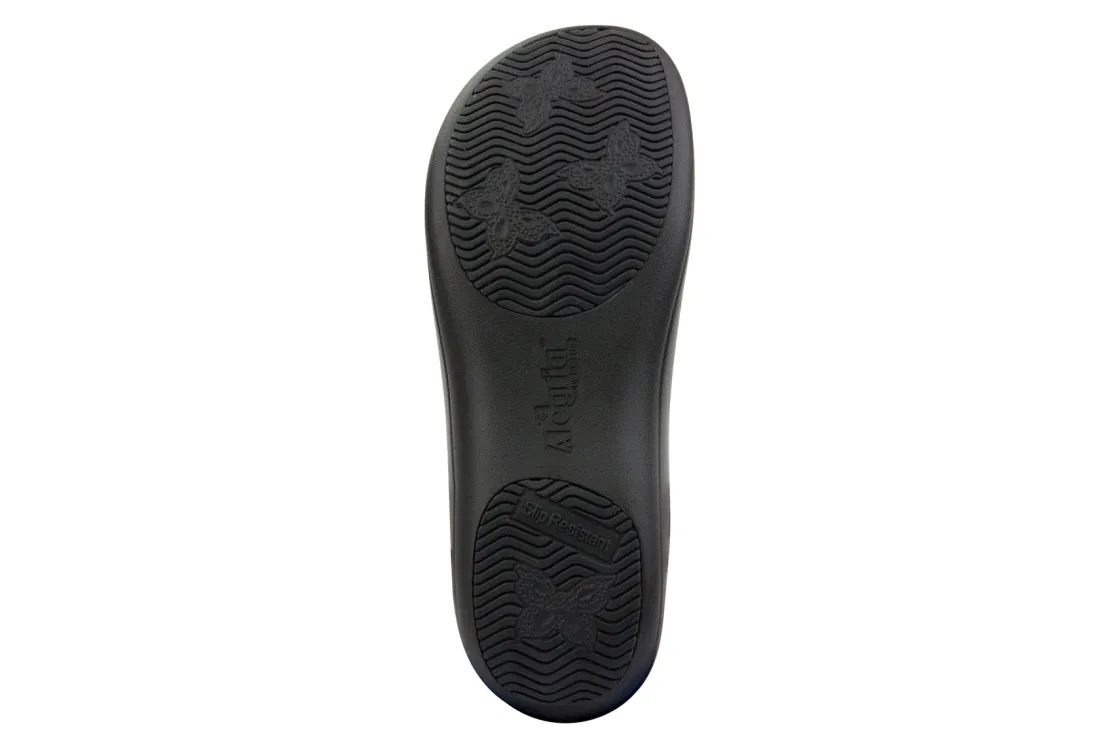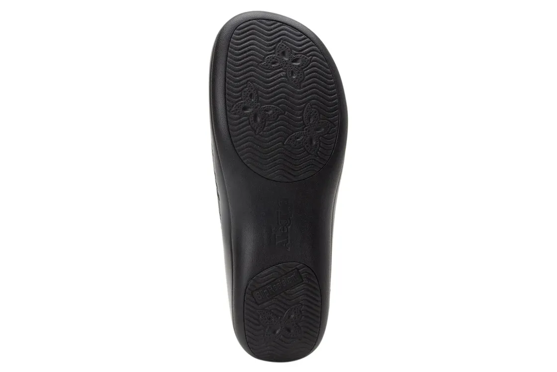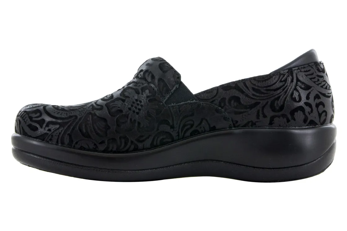 Alegria Keli is a comfortable professional clog. These work shoes have many different leather uppers, removable footbed, a suede leather footbed and sturdy PU outsole. A padded collar adds comfort, while double elastic gores secure feet for all-day wearability.