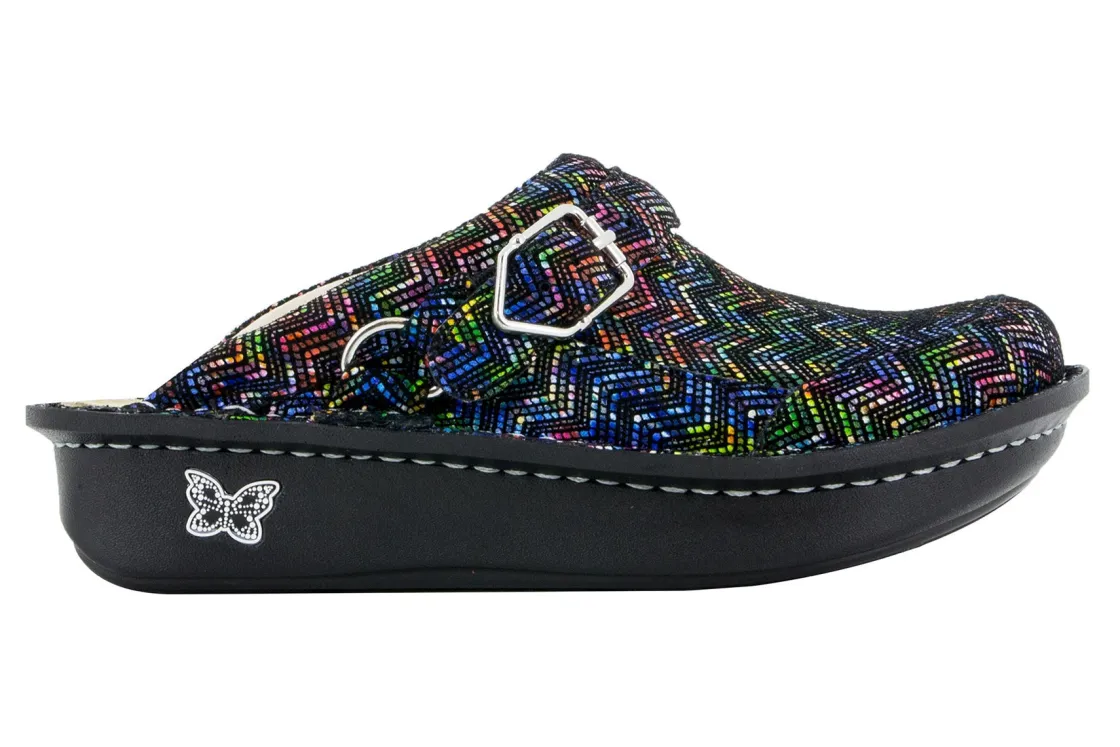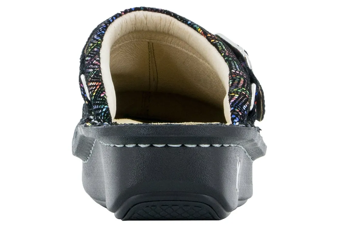 Alegria Seville is a versatile and comfortable clog. Features include an adjustable swivel strap that turns backless clogs into a slingback and PU outsole. A variety of leather uppers, cork and latex footbed and a moisture wicking leather lining completes these functional clogs.