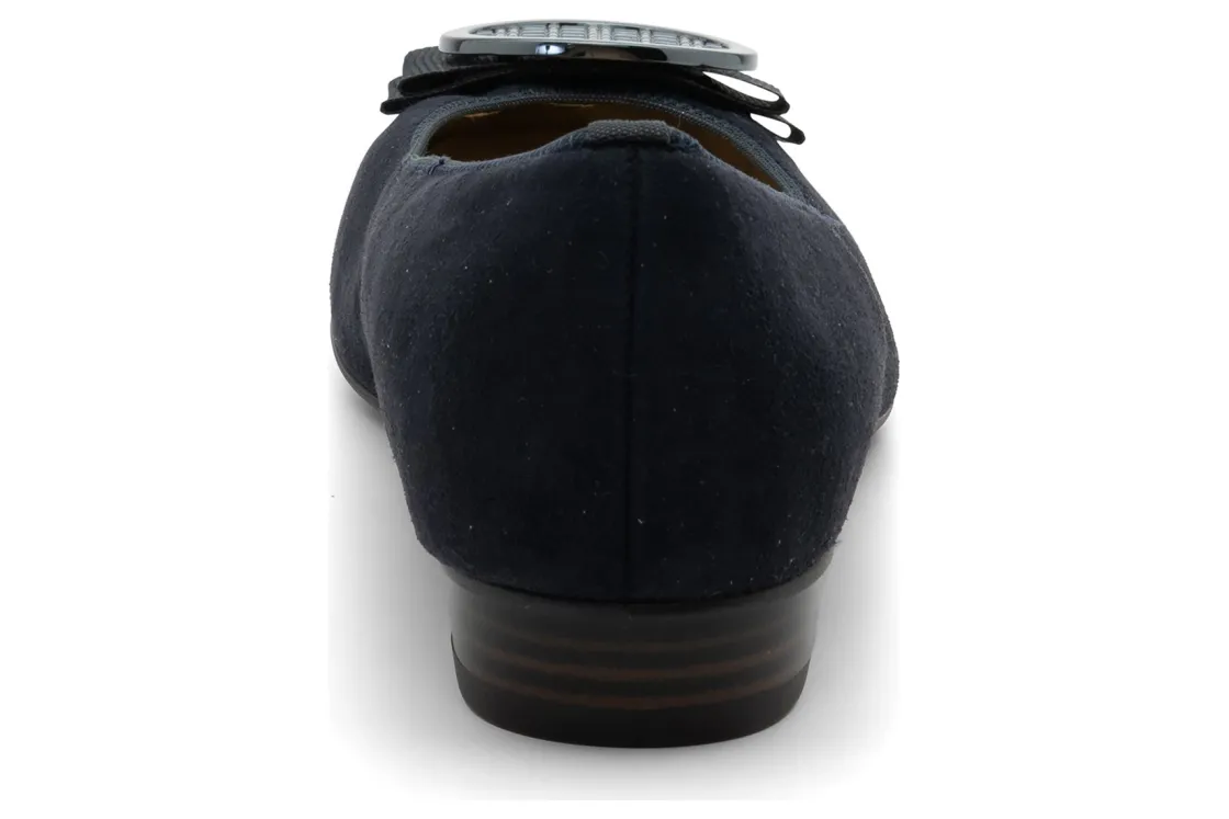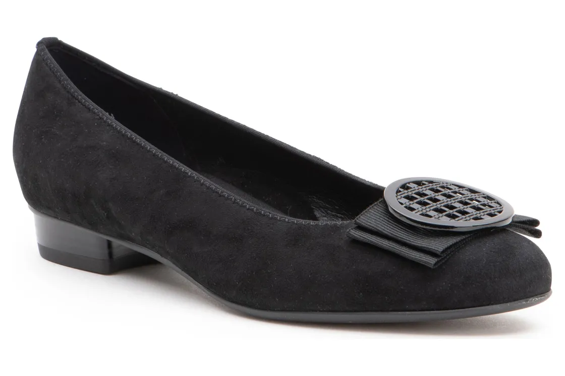 The ara Bambi is a classic smart ballet flat that is ideal for everyday to evening. An elasticized topline creates a custom fit with added comfort. This chic flat features a metallic ornament, fabric bow trim, a rounded toe, and ara’s HighSoft technology.