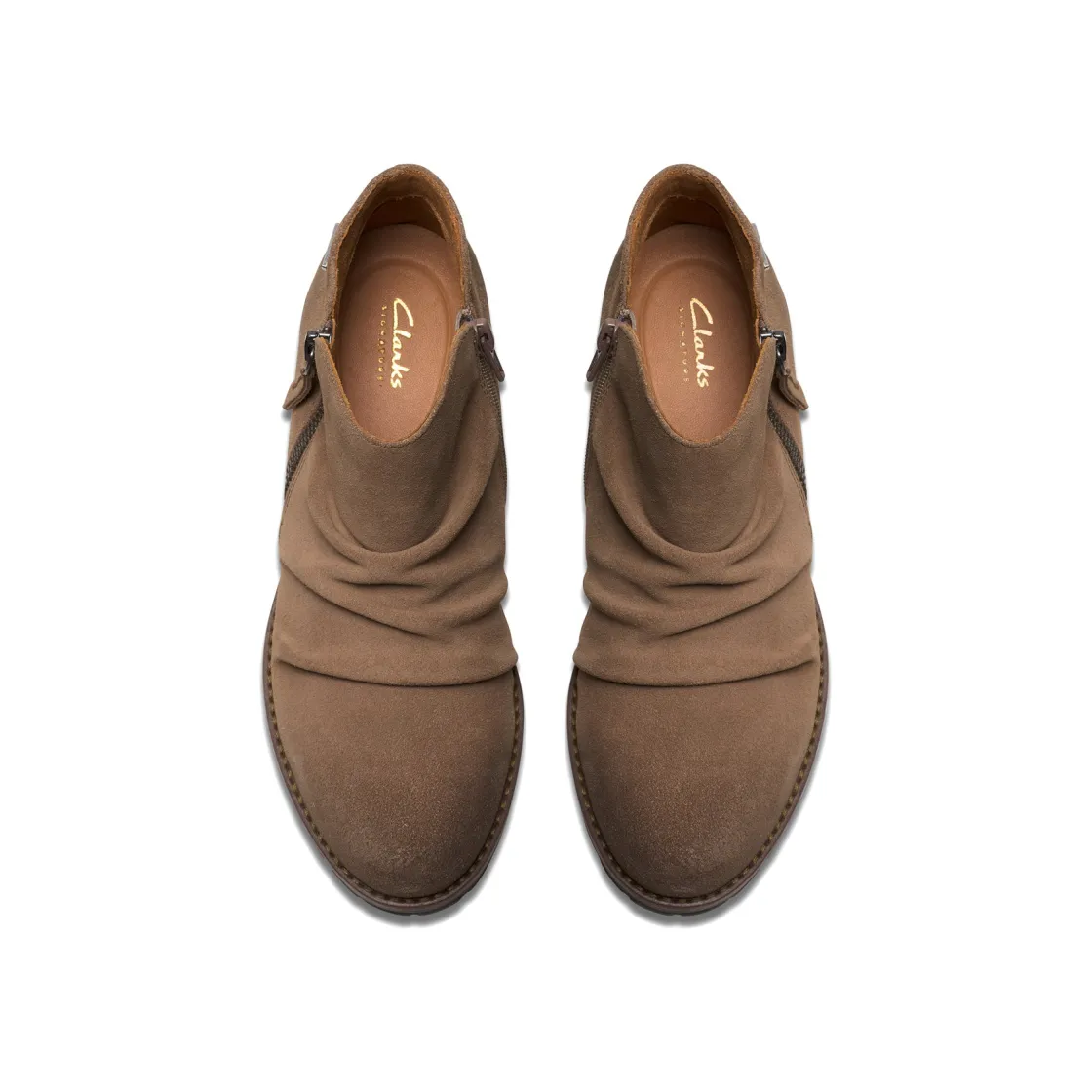 Casual ankle boot Clarks Nissini Top WP is prepped for wet weather with its practical waterproof construction. Crafted in premium suedes or leathers that boast an on-trend ruched design, this zip-up silhouette makes use of a flexible lugged rubber outsole that paves the way for confident movement. It keeps your comfort a top priority too, with plenty of soft, cushioning underfoot support. The ultimate balance of laid-back aesthetics and all-weather comfort – consider your weekend style levelled-up!
