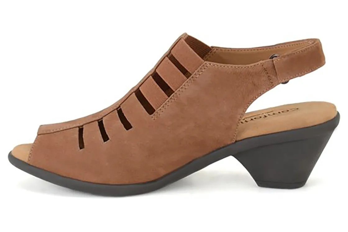 Comfortiva Faye is a strappy sandal built for comfort. Enjoy leather uppers, an adjustable slingback strap, flexible gore and memory foam cushioned footbed. Other features include a breathable synthetic lining, 2-inch heel height and a slip-resistant TPR outsole.