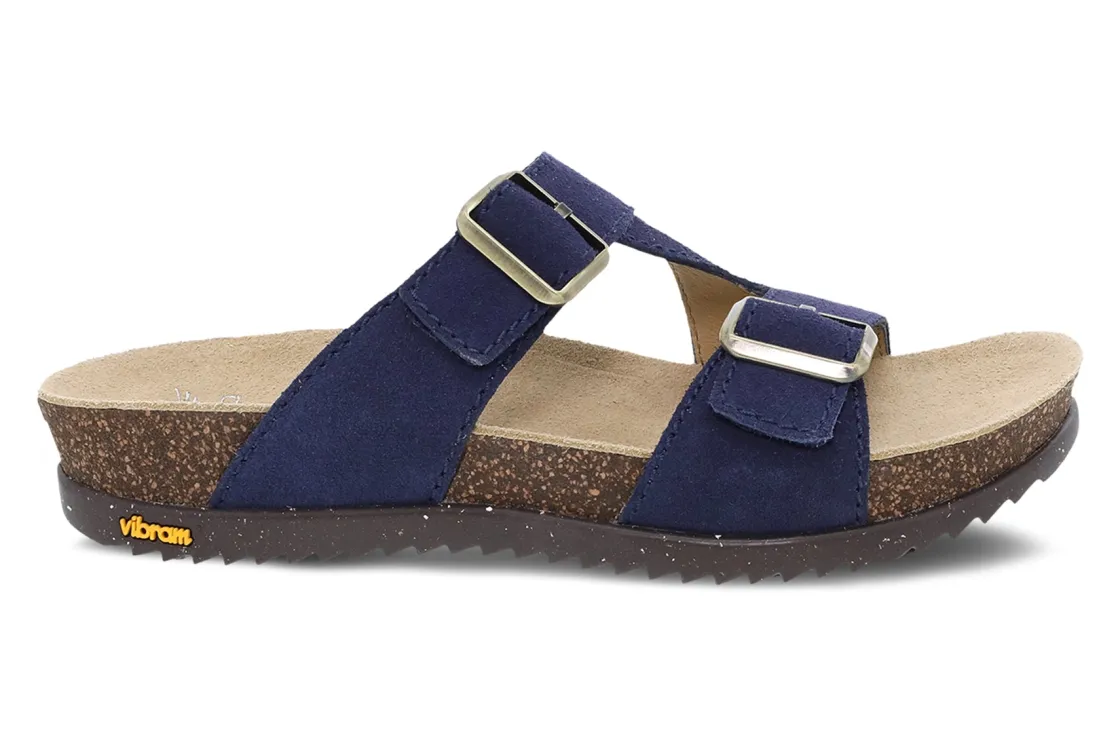 Casual and classic, the Dansko Dayna sandal is a go anywhere and take everywhere style. This double strap slide has hook and loop adjustability to assure the perfect fit. Dayna features chrome-free suede uppers and chrome-free leather linings, a contoured cork and EVA midsole which is lightweight and cushioned for shock absorption, and a Vibram ECOSTEP EVO rubber outsole.