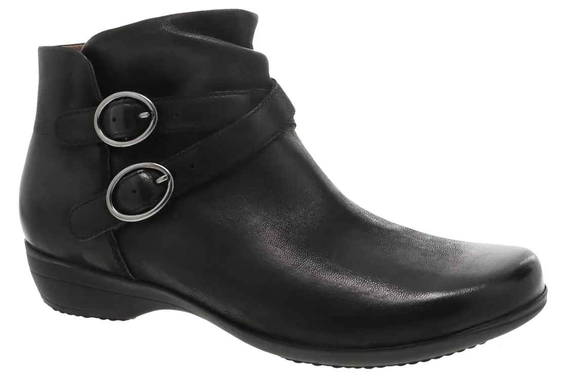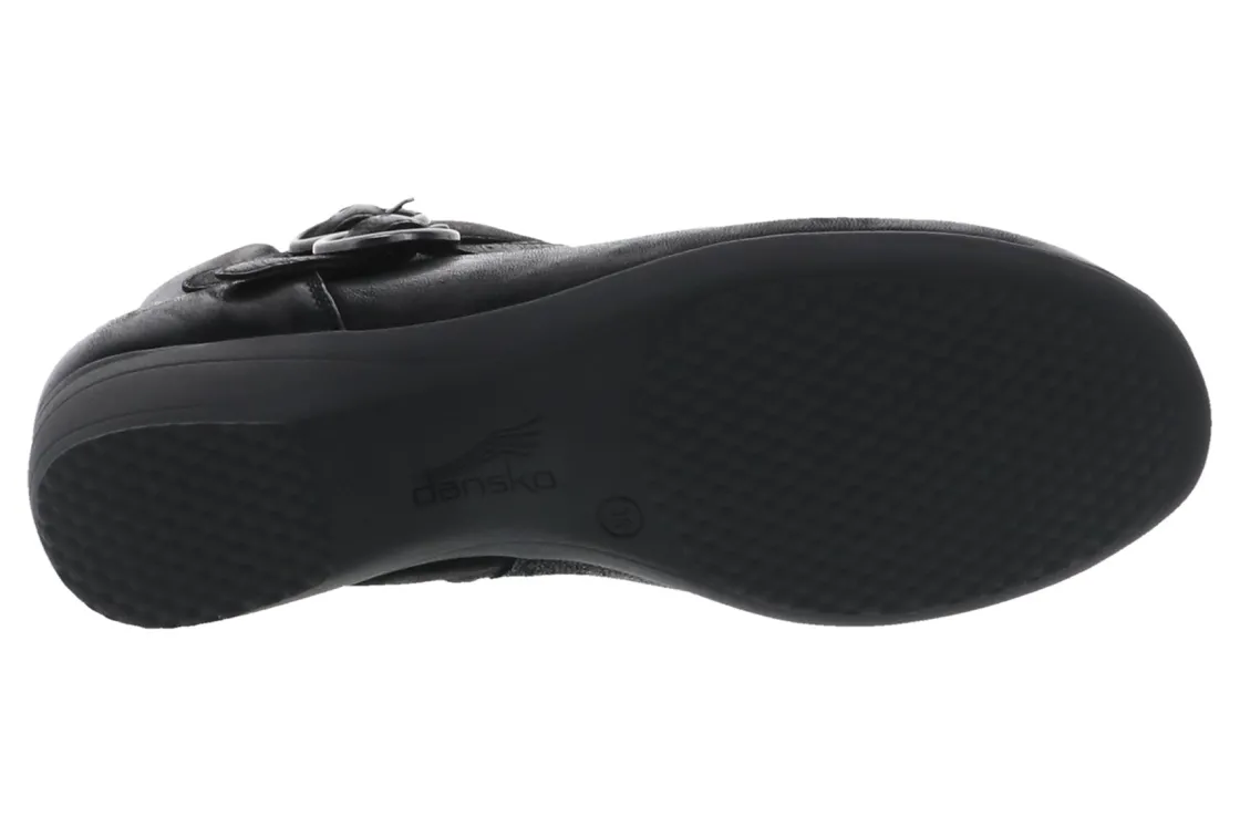 Faithe is a slip-on ankle bootie with an inside zip and double adjustable buckles, soft leather and textile linings for all-day comfort, a removable, molded EVA footbed with Dansko Natural Arch technology for support and cushioning, and a rubber outsole for long-lasting wear.