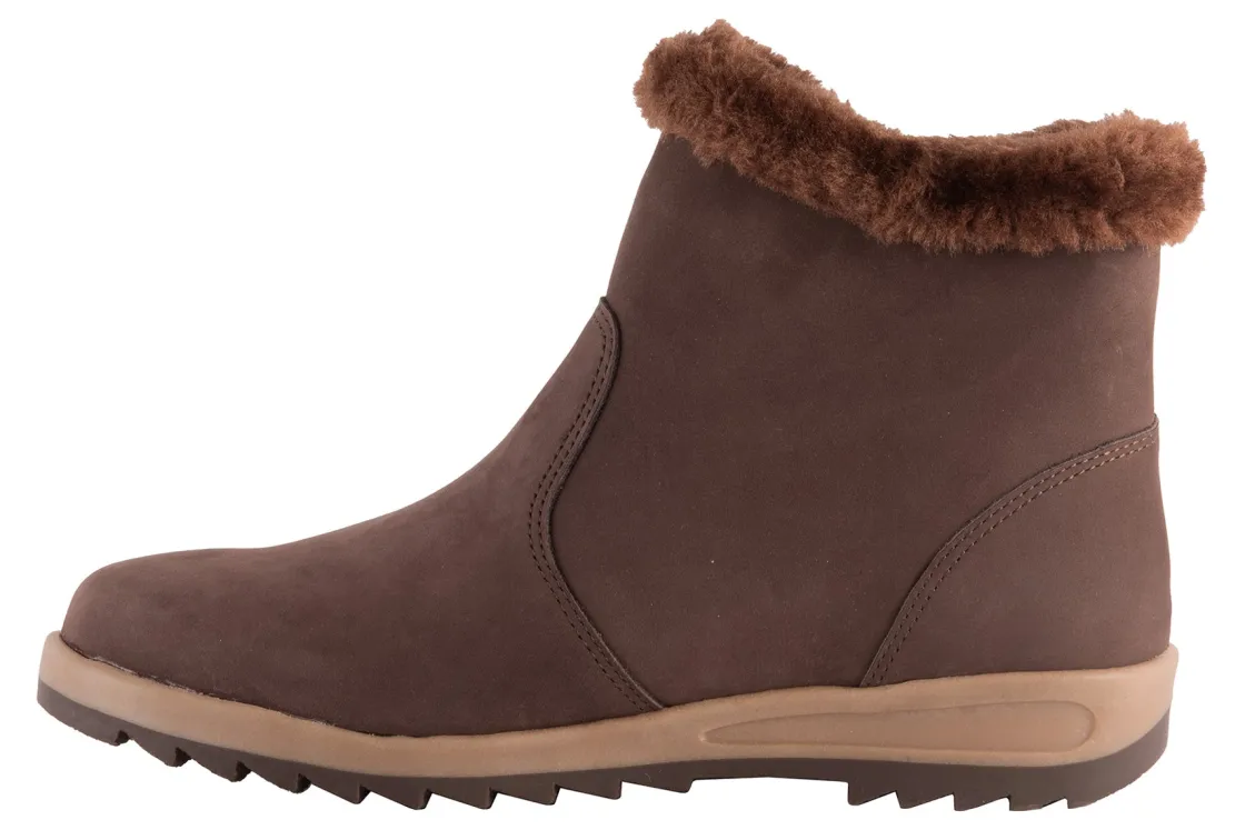 Soft nubuck upper with faux fur collar.Updated skid resistant opposite ridged rubber outsole.Angled exterior side zipper for easy on and off.Tricot linings and removable foam padded insole. 1 inch unit bottom height, 4 3/4 inch shaft height,11 inch shaft circumference.