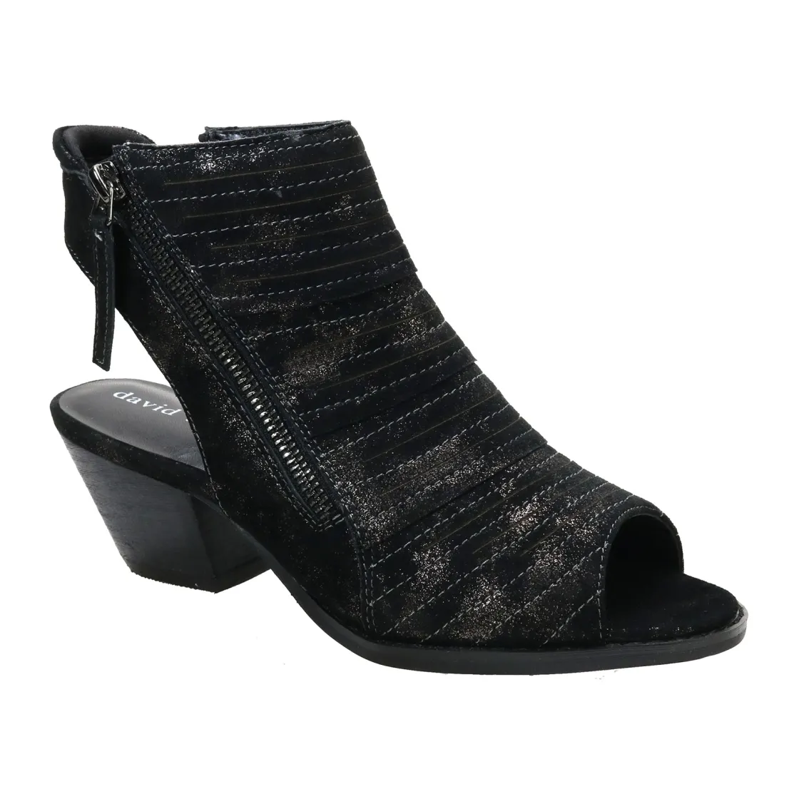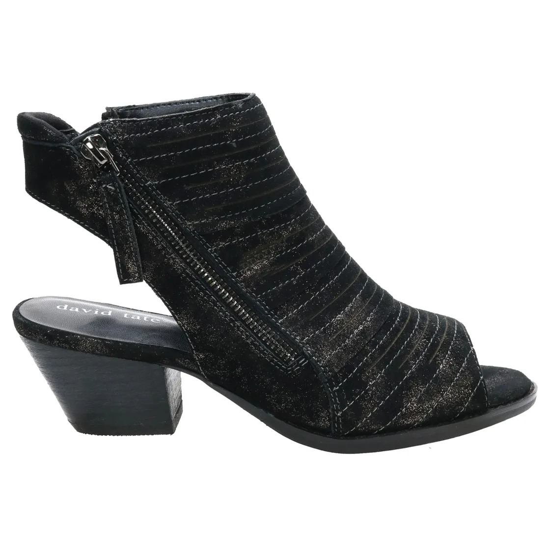 The David Tate® Sideview sandal is a stylish and flexible option for any occasion. Its open-toe and open-back design, coupled with dual side zippers, give it a modern and chic look. Made from antique metallic suede and featuring a leather stacked heel, this sandal not only looks fantastic but also provides a comfortable and snug fit.