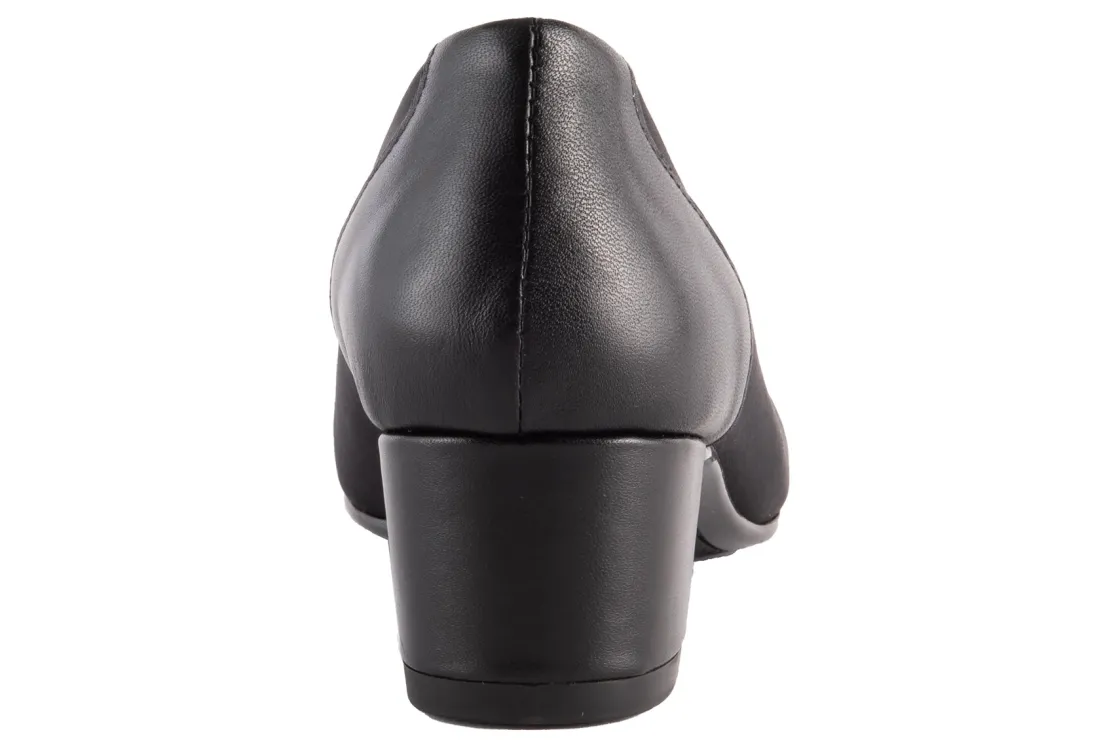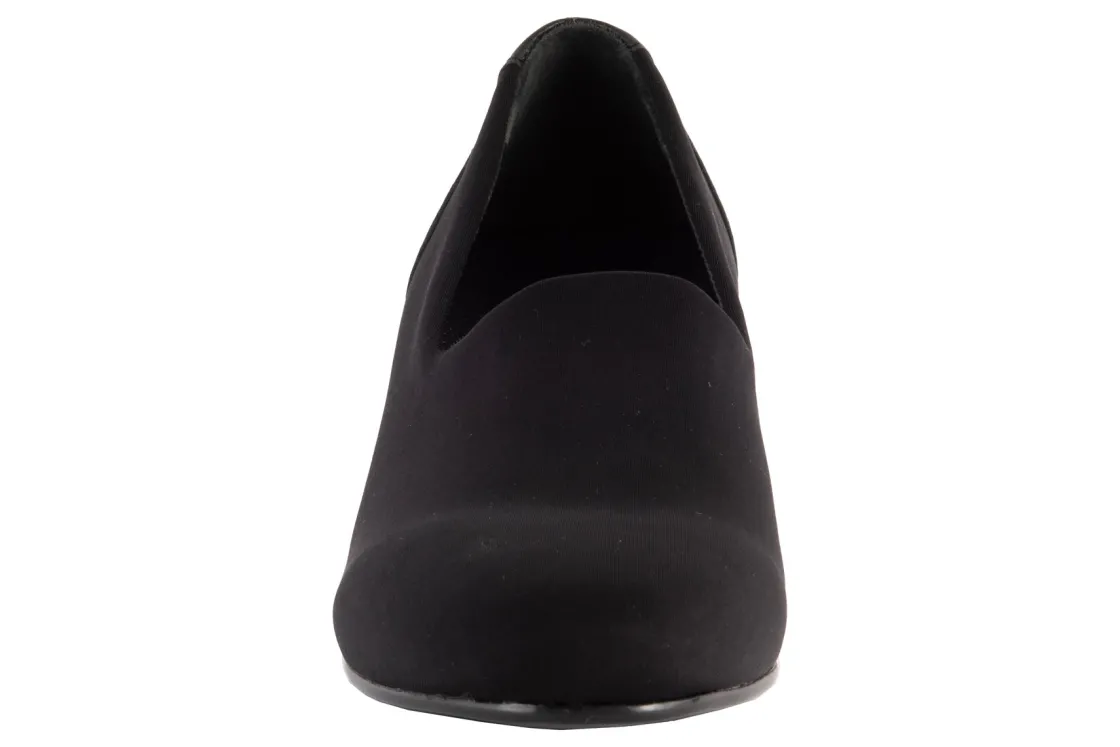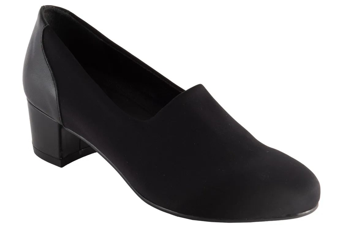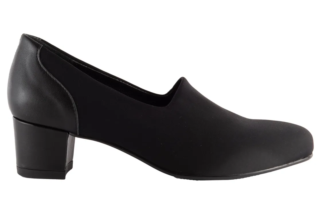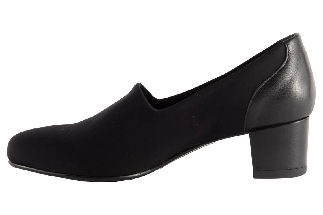 Classic pump silhouette with a breathable microfiber upper.Stretches in the throat for a snug fit.1 1/2 inch leather covered heel.Extra foam cushioned footbed for walking comfort.Flexible skid resistant outsole.