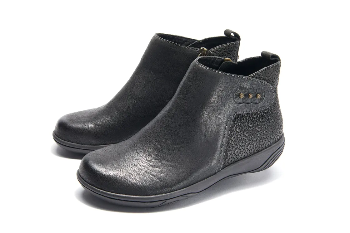 Save yourself from discomfort with the ultra-stylish Althea ankle bootie. Side zip closure with side hook-and-loop side for easy on and off along with hand tooled leather detail. Round toe with our unique Fully Removable, anatomically correct Equilibrium + insole included, will keep your feet properly aligned and supported throughout the day. Footbeds and linings are treated with Silver Ion antimicrobial solution to protect against fungus, bacteria, and odor.