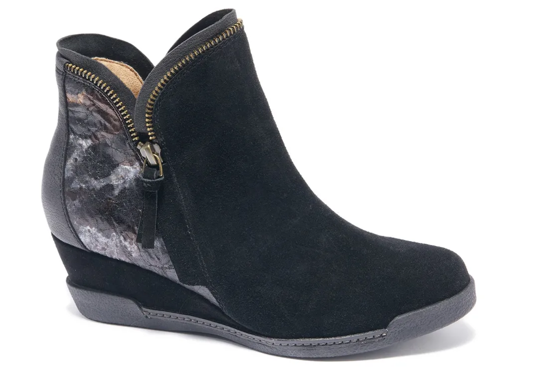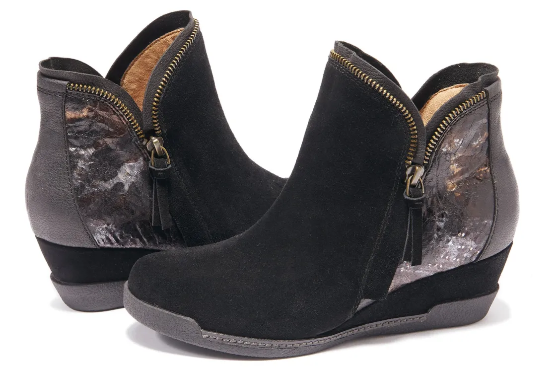 Add a little height and a lot of comfort to your ensemble with the Hälsa Dana wedge bootie that features adjustable side zippers, Hand Tooled leather with a round toe. These Wedge Booties have a fully removable, anatomically correct Equilibrium + insole included, which will keep your feet properly aligned and supported throughout the day. Footbed and linings are treated with Silver Ion antimicrobial solution to protect against fungus, bacteria, and odor