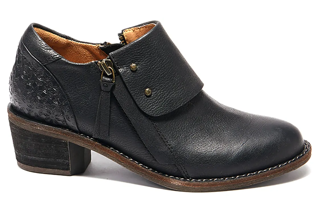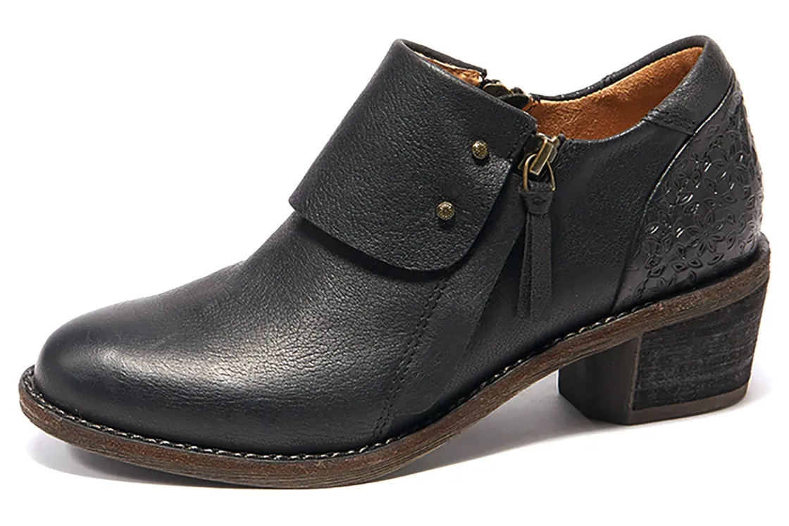 Halsa Footwear Michelle is a fashionable women’s boot. Features include a leather upper with metallic studs, zippered side closure and flexible rubber outsole. A closed almond toe, block heel and removable cushioned insole outlines these chic ankle boots.