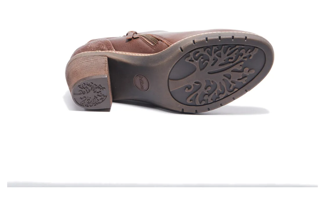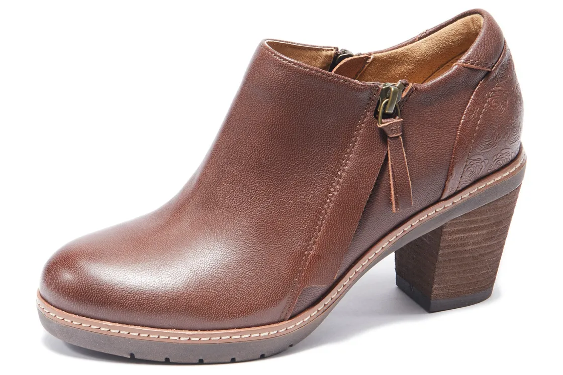 Halsa Footwear Rylee are comfortable and stylish women’s boots. These ankle booties have floral embossed leather uppers, removable insole and rubber outsole. Double side zippers, moisture reducing antimicrobial treatment and 2 ¾ inch stacked heel elevates these trendy boots.