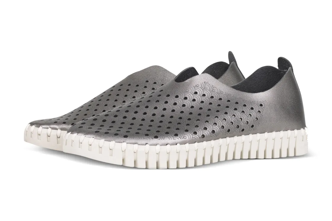Laser cut Tulip shoe. This shoe is very comfortable and has a great appearance. It is decorated with a laser cut pattern ensuring breathability. The upper fabric is made of metallic microfiber. It is attached to the outsole using no glue, only recycled thread. Outsole: 75% natural rubber and 25% recycled rubber. Insole: 60% EVA, 40% pig suede.
