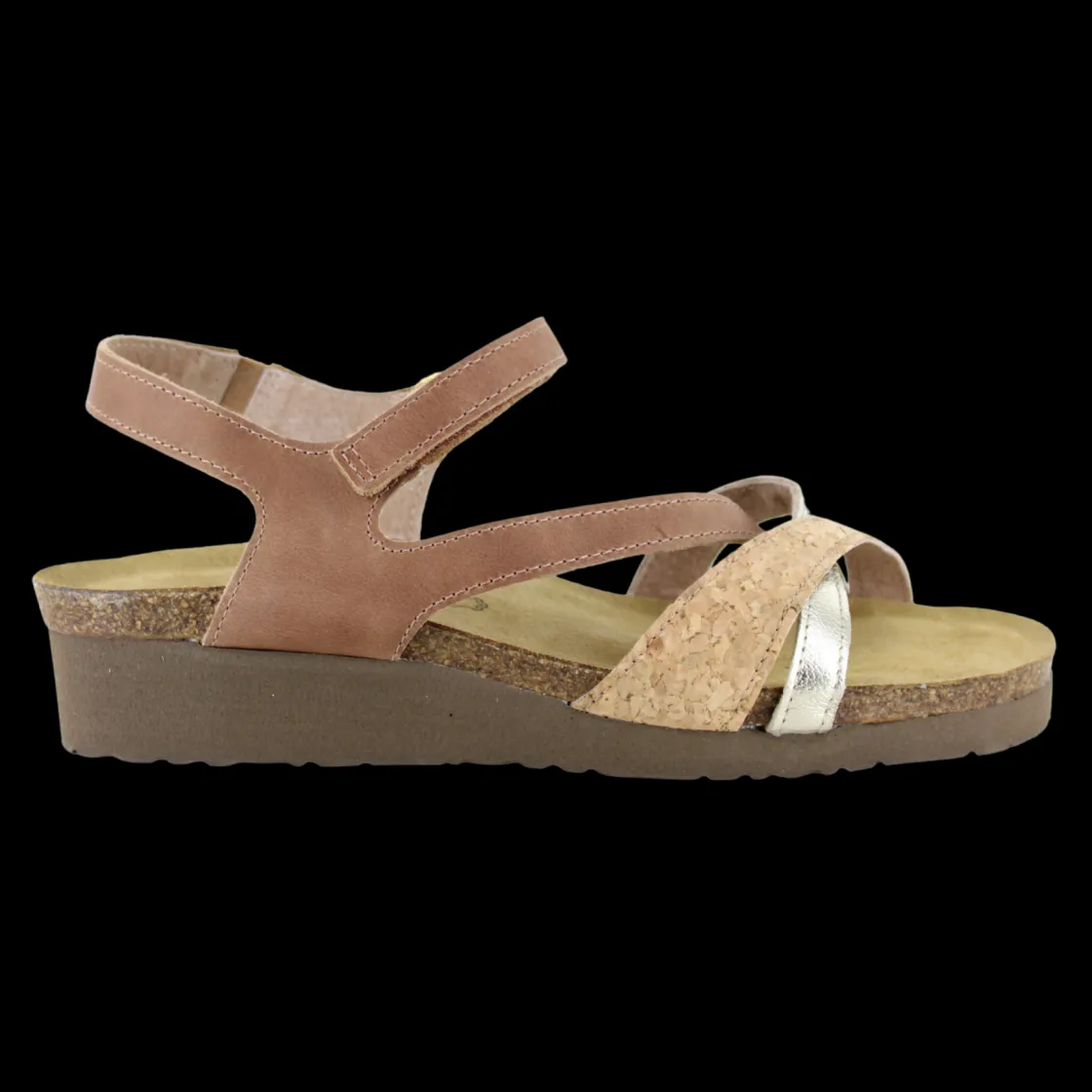 The Naot Sophia is a sandal with contrasting crisscross leather straps. This style has a hook and loop strap at the instep for adjustability and a back strap with gore for stability. Naot’s anatomic cork & latex footbed is wrapped in a pampering suede and molds to the shape of the foot with wear. American Podiatric Medical Association (APMA) Accepted for promoting good foot health.
