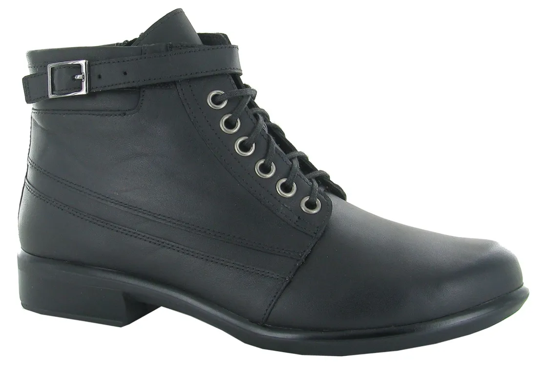 The Naot Kona is fashionable boot that provides a sleek and dressy look. This style features a hook and loop faux buckle as well as a zipper. This boot has padded technical lining for comfort, warmth & moisture absorption. Naot’s removable, anatomic cork & latex footbed is wrapped in microfiber & leather and molds to the shape of the foot with wear. The Aura Collection features a 1.5″ polyurethane sole with a metal shank which is extremely lightweight