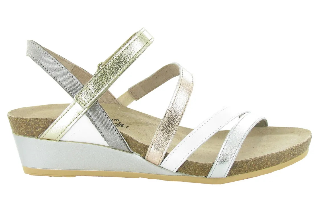 Naot Hero is a stylish wedge sandal with contrasting leathers. An ankle strap offers stability and cork and latex footbed molds to the shape of the foot. An elastic instep strap allows for ease of wear, while a leather lining provides for extra comfort.• Leather Upper.• Cork Footbed.• Adjustable Strap for a more customized fit.• PU Outsole.• Heel Height: 1¾ inches.