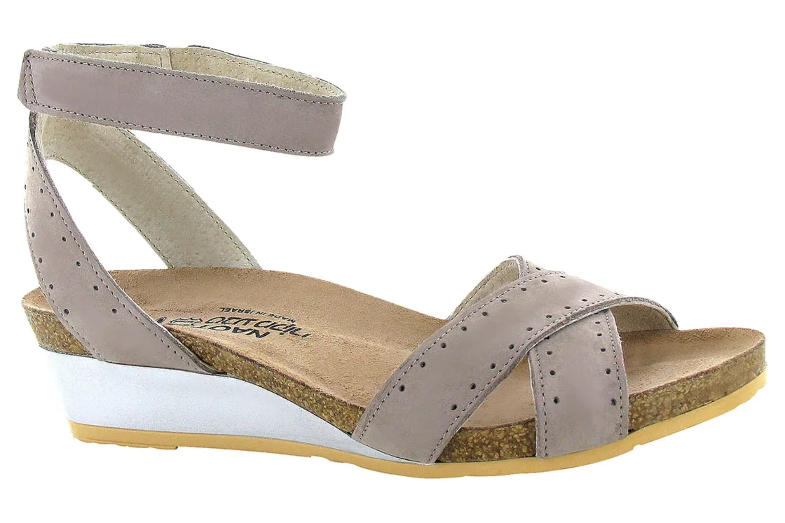 Warm weather style meets ultimate comfort in the women’s Naot Wand sandal. The strappy leather upper features circular cut outs and an adjustable hook and loop strap for a customized fit. The anatomic cork and latex footbed molds to the shape of your foot for a personalized fit, while the durable outsole provides traction and stability.