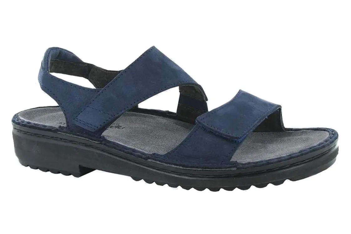 The Enid is a completely adjustable sandal with a padded backstrap. This style has a hook & loop closure at both the instep & front strap with added gore at the instep for adjustability. Naot’s removable, anatomic cork & latex footbed is wrapped in pampering suede and molds to the shape of the foot with wear. The Low Scandinavian Collection features a 1.25″ polyurethane sole which is extremely lightweight and durable.American Podiatric Medical Association (APMA) Accepted for promoting good foot health.