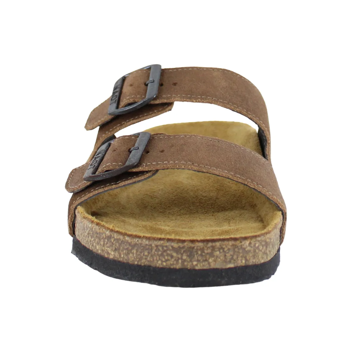 Suede leather upper with two adjustable buckle closures.