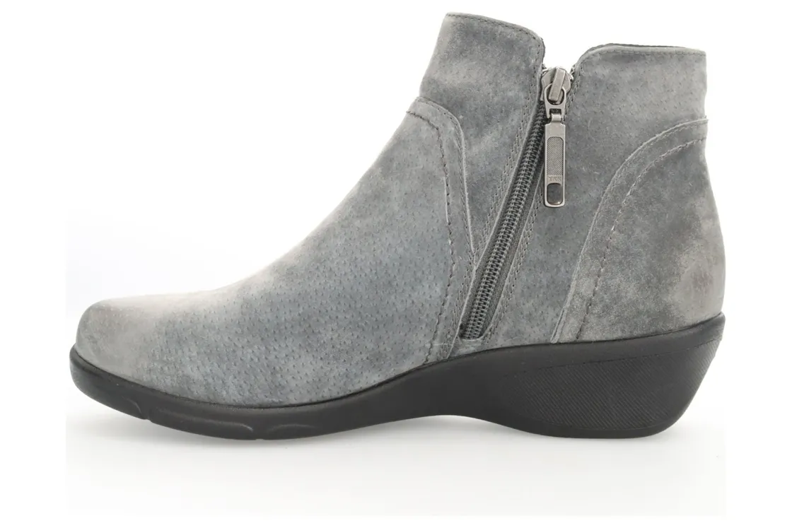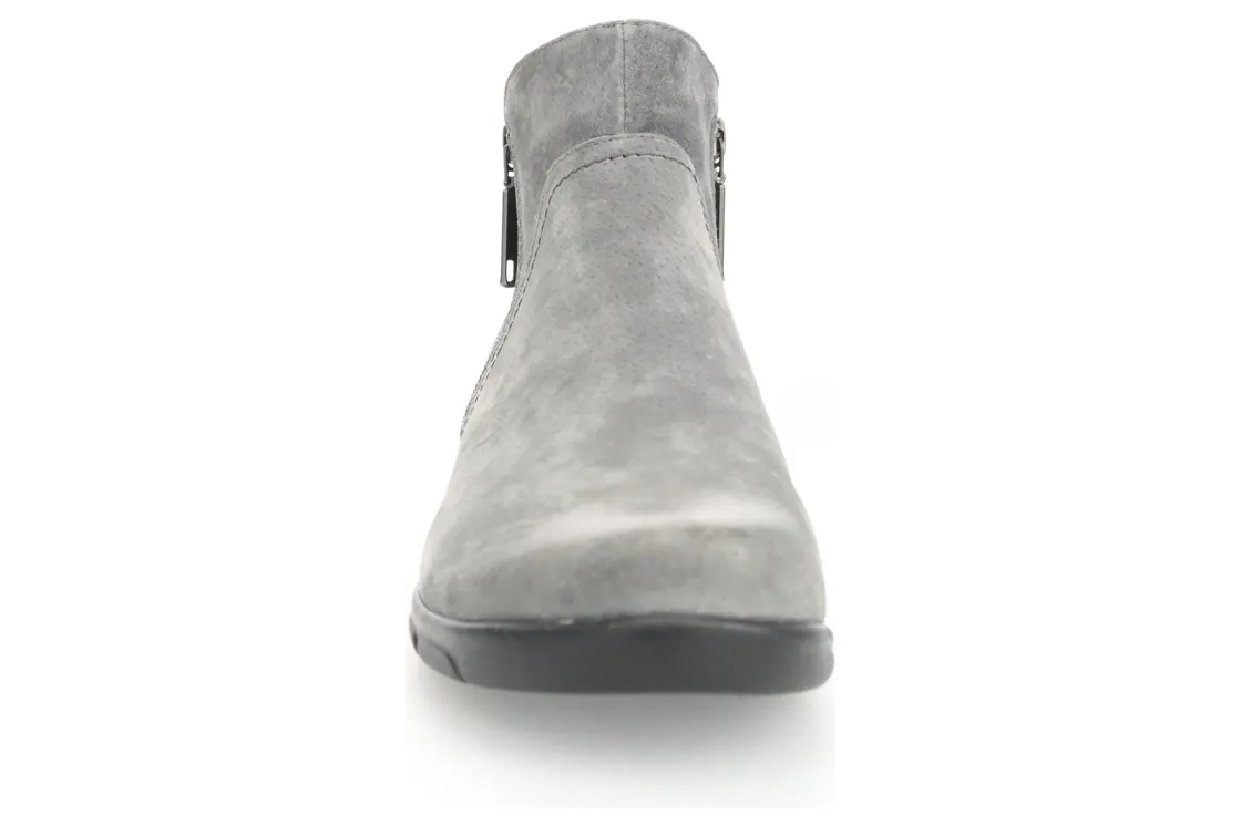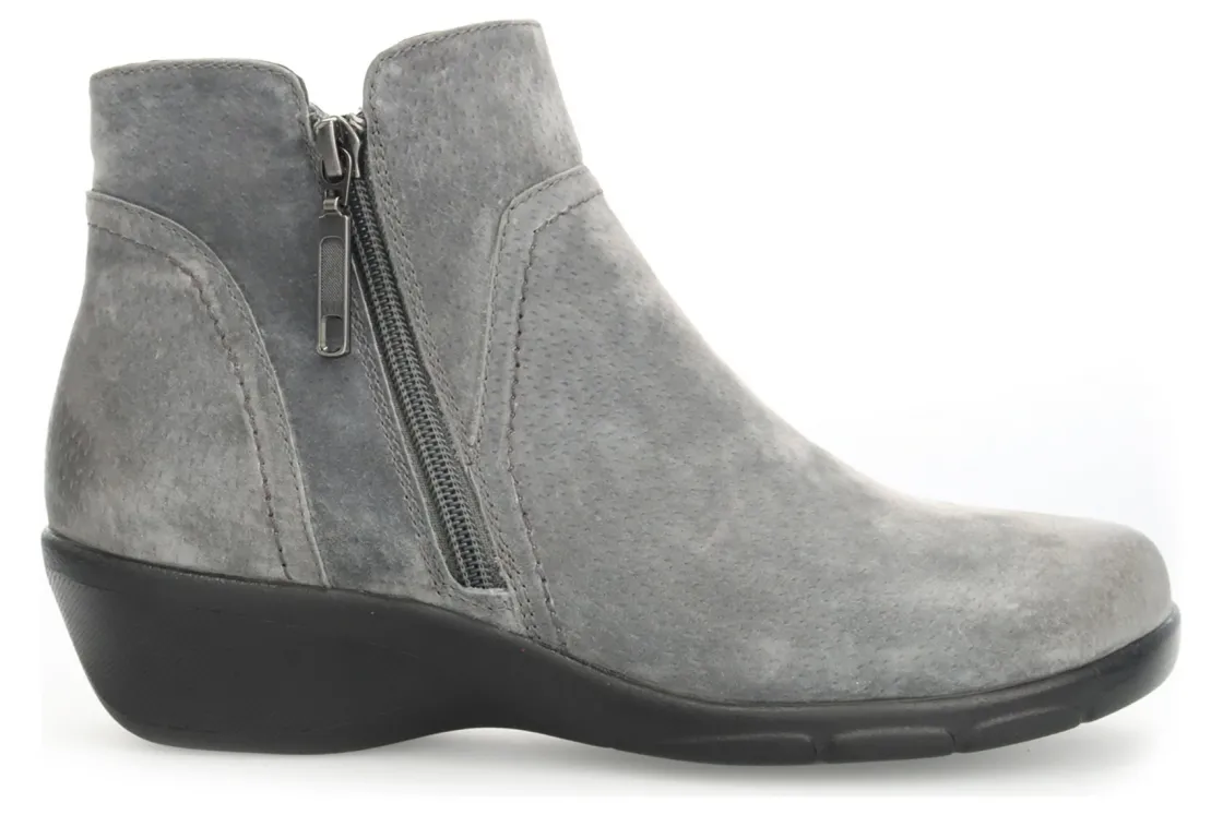 Pig suede bootie with twin zips. PU foam made with recycled materials and active carbon. PU outsole absorbs shock to reduce fatigue with rubber tread inserts for traction.