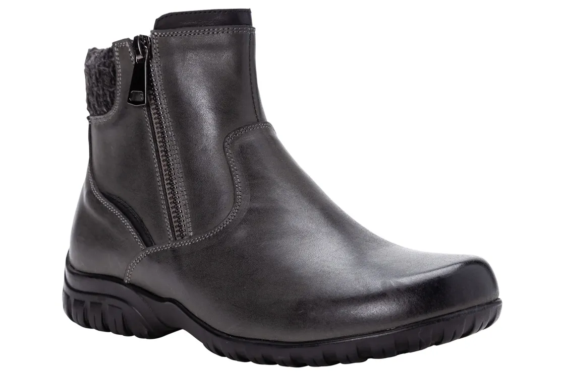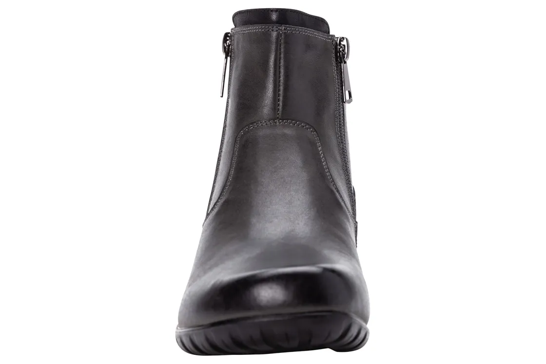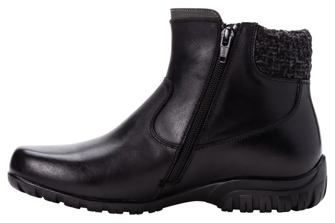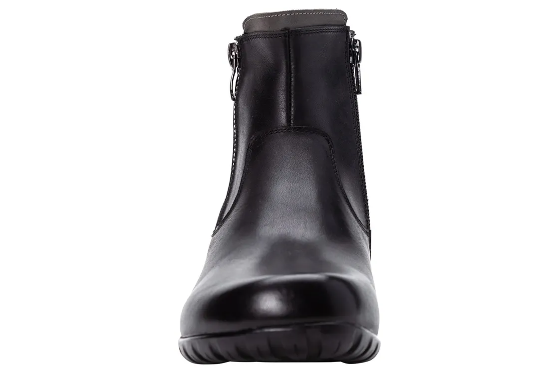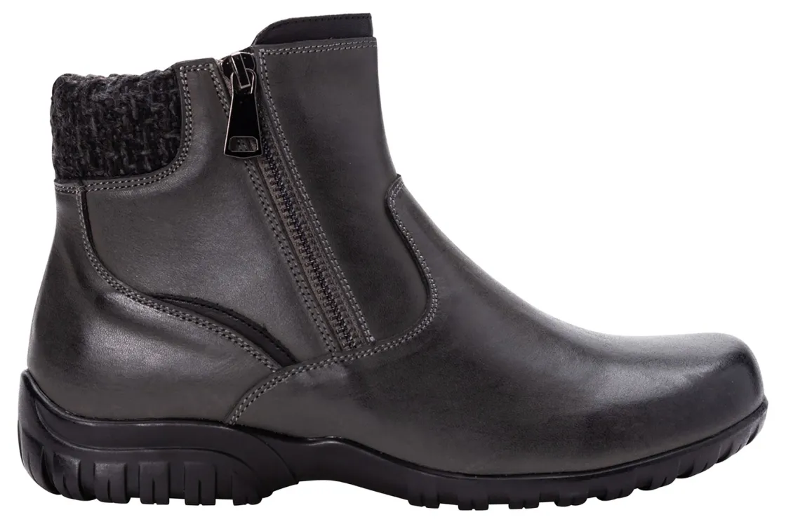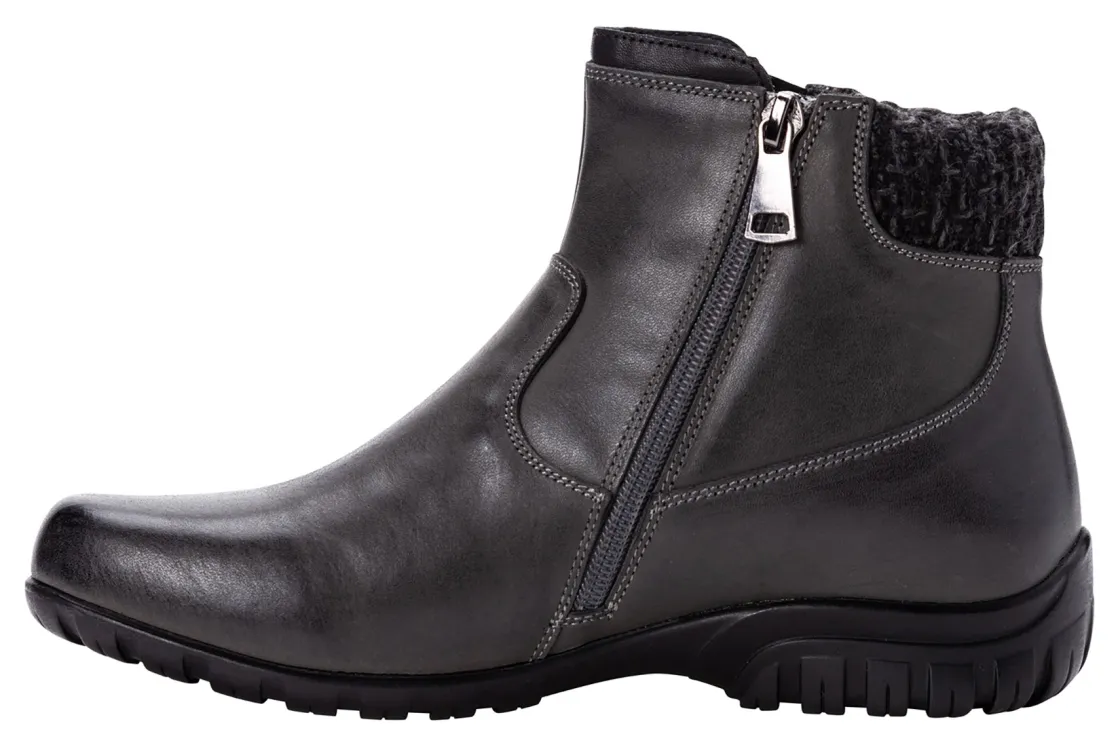 Propet Darley is a stylish and comfortable women’s bootie. These chic cold weather boots have leather uppers, twin zippers and a flexible rubber outsole. A Scotchgard treatment is water repellent and resists stains, while a removable cushioned footbed provides added comfort.Leather Upper.Twin Zippers.Removable Footbed.Flexible Rubber Outsole.