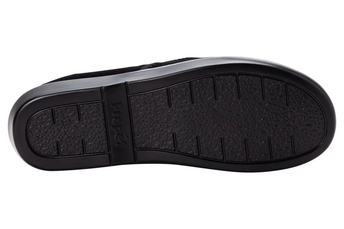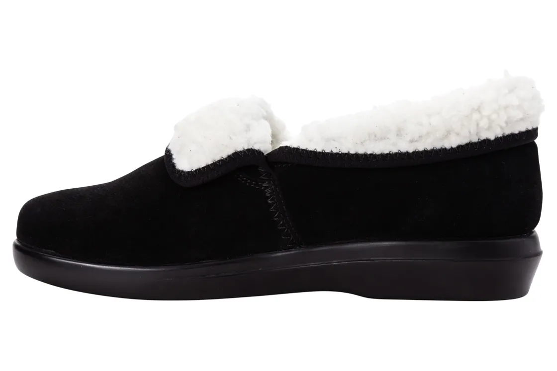 Propet Colbie is a warm and roomy slipper. Features include a suede upper with faux fur lining, slip-on construction, removable footbed and PU outsole. A high density PU foam ensures a cooler footbed, while the warm faux fur trim keeps feet warm during cold weather days.