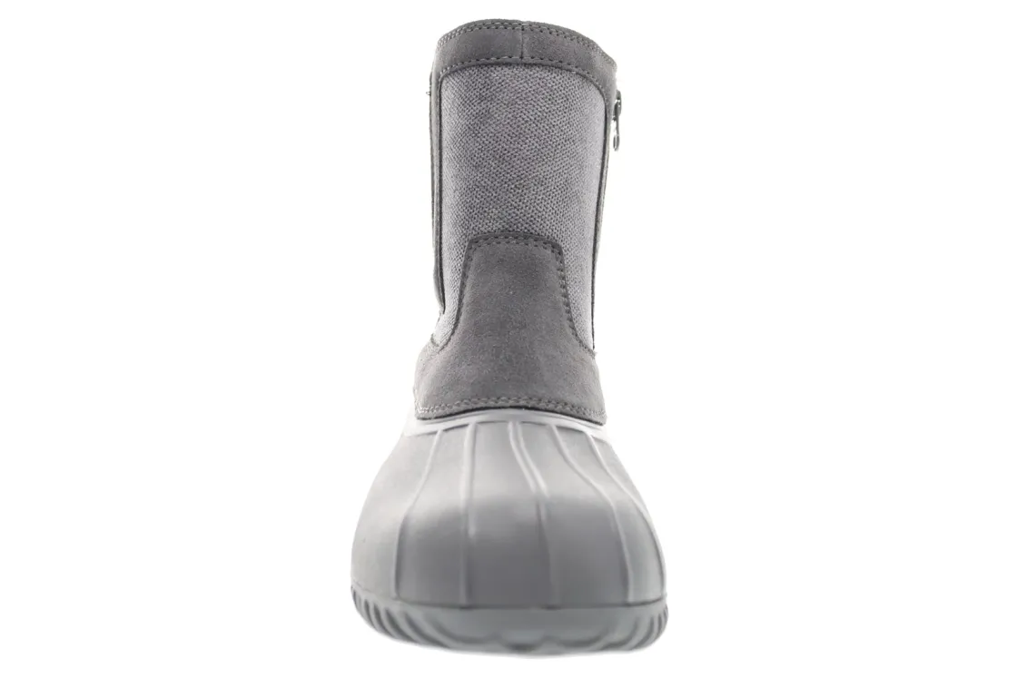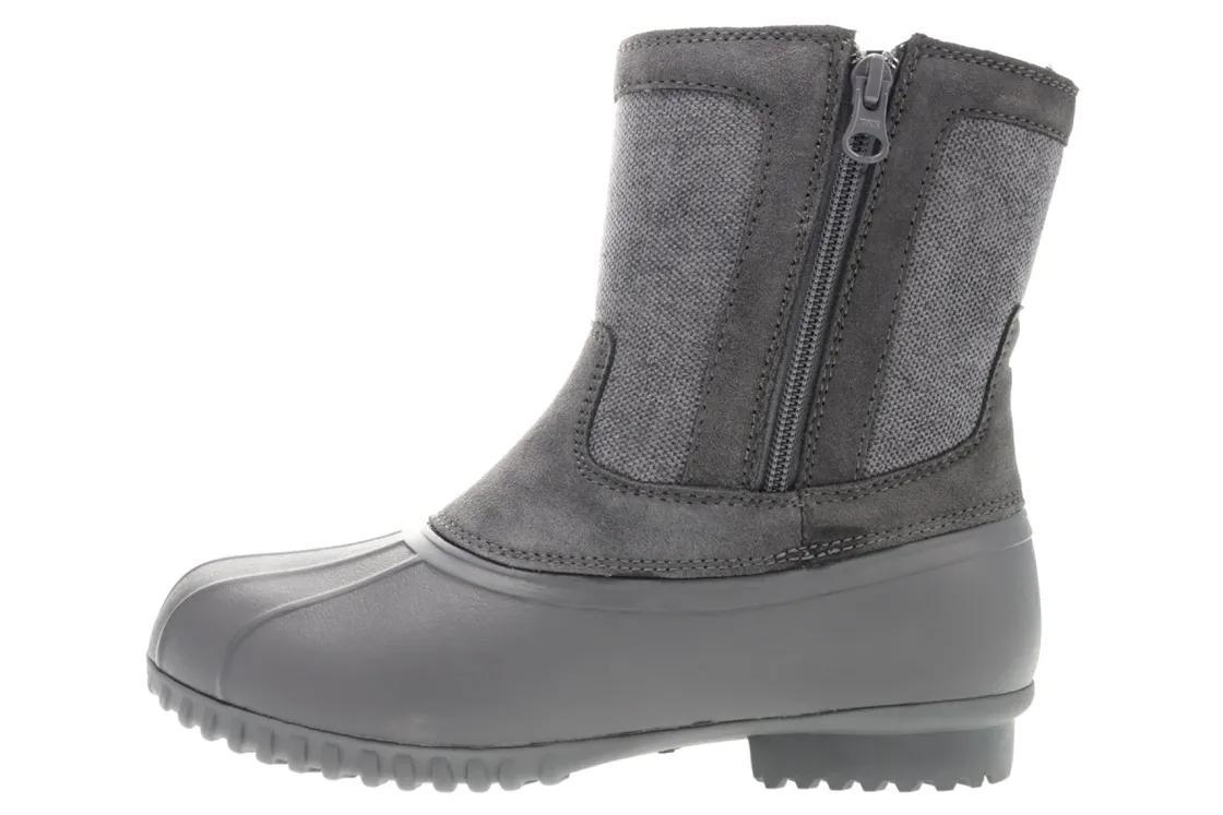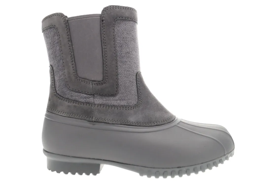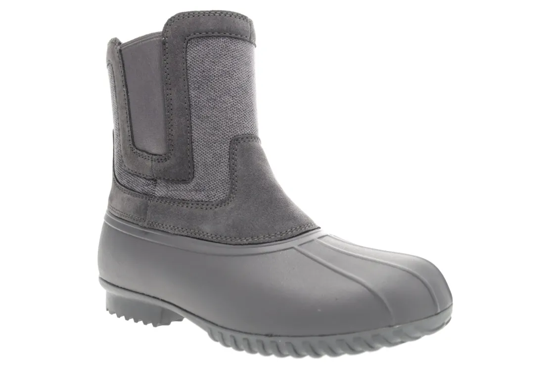 Propet Insley is a cozy boot for cold and wet weather. These sturdy boots have a suede and fabric upper, faux fur lining, molded EVA toe and rubber outsole. An inside zipper, heat-retaining insole and 7-inch shaft height outlines these rugged and warm duck boots.