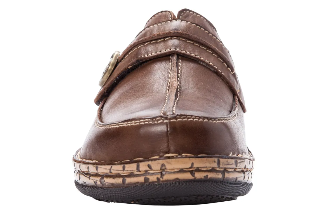 Slide into the women’s Propet Jana clog and experience all-day comfort. The full-grain leather upper is adorned with a decorative strap for added style. The removable OrthoLite® footbed accommodates custom orthotics, while the durable polyurethane outsole provides traction.Full-grain leather upper.Decorative strap for added style.Removable OrthoLite® footbed accommodates custom orthotics.Durable polyurethane outsole provides traction.