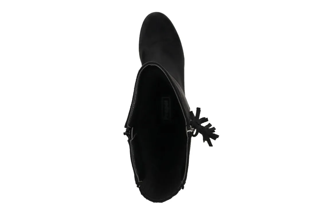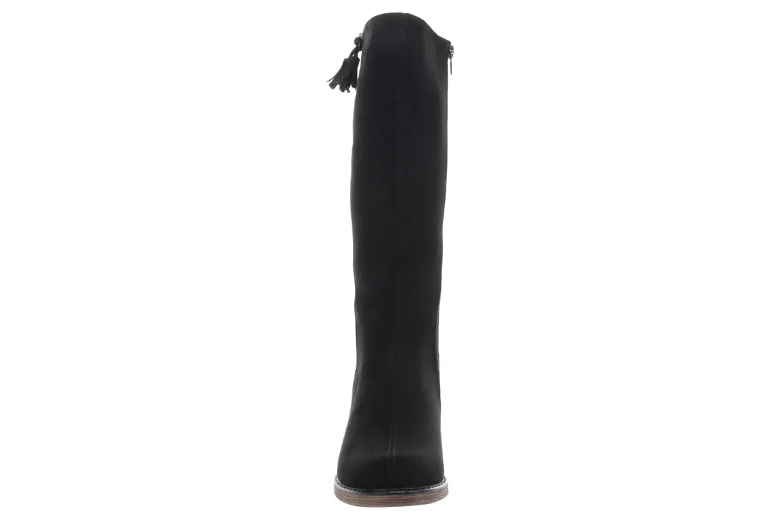 Tall shaft suede boot with inside zip and hidden goring plus decorative tassel.