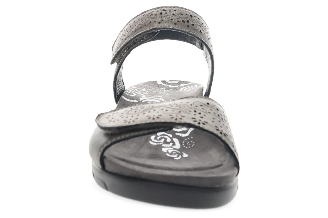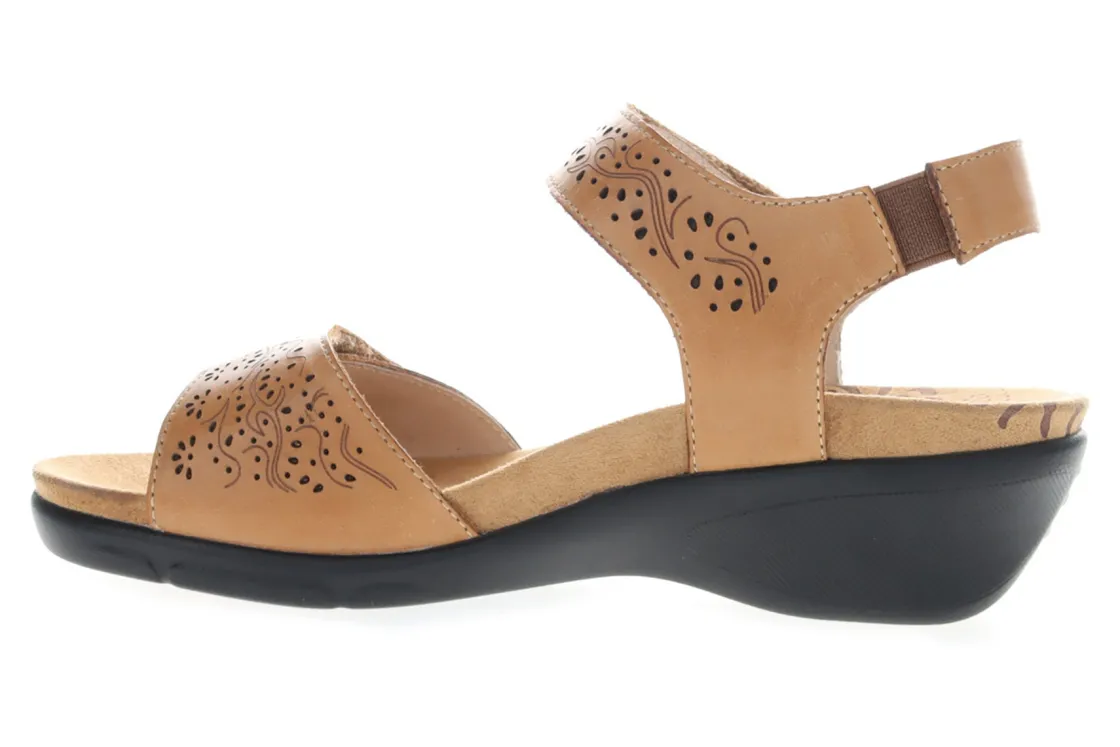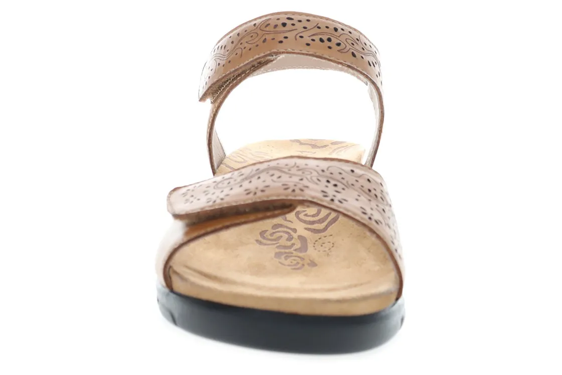 Leather two strap sandal with enchanting laser cut detailing and adjustability of hook and loop. Micro-fiber lined Open cell foam footbed. PU outsole absorbs shock to reduce fatigue with rubber tread inserts for traction.