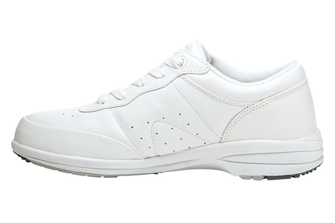 Propet Washable Walker Sr is a durable and comfortable sneaker. These active shoes have a machine washable leather upper, PU foam insole and rubber outsole. A padded collar and tongue adds comfort, while a lace-up design ensures a snug and supportive fit.