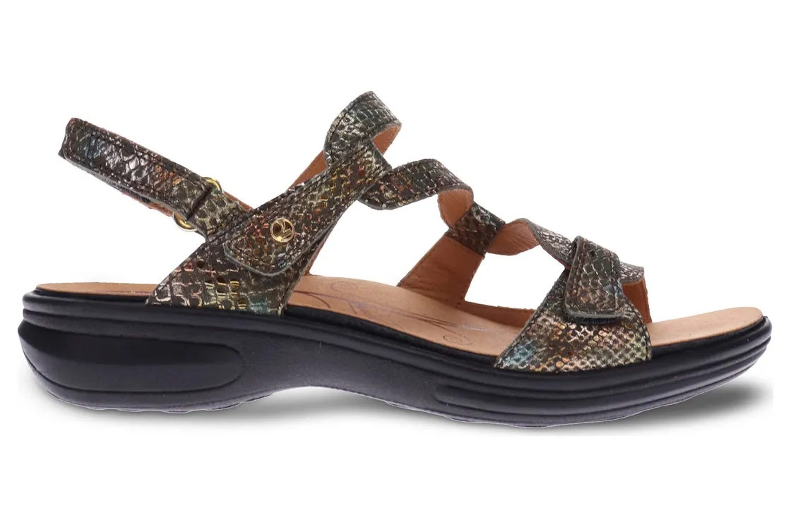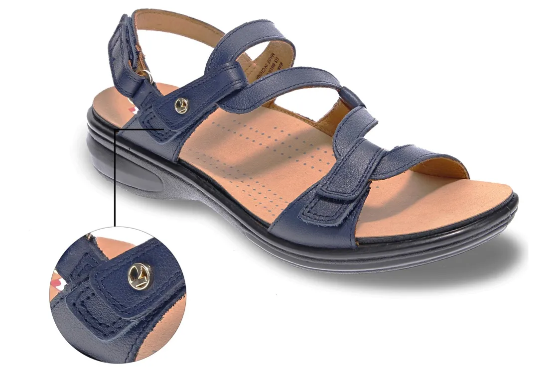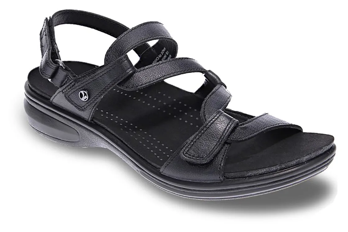 We’ve struck the perfect balance of contemporary design and optimum comfort when creating the Emerald sandals. Crafted from soft luxe leather, these women’s sandals with adjustable straps cradle the foot so you feel supported as you stroll. This 3 strap sandal fits both narrow and wide feet and has a molded footbed that can be easily removed to fit your orthotics, AFO’s or braces.FEATURES- Premium leather upper and lining.- Contoured footbed with arch support- Removable footbed to insert custom orthotics, AFO’s and braces- Received APMA Seal of AcceptanceSIZE & FIT- Fits true to size- Those between sizes may consider a size bigger or opt for the wide fit- Adjustable straps- Includes revere strap extensions for a wider fit