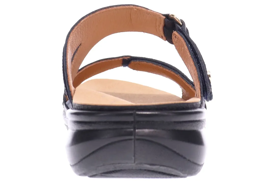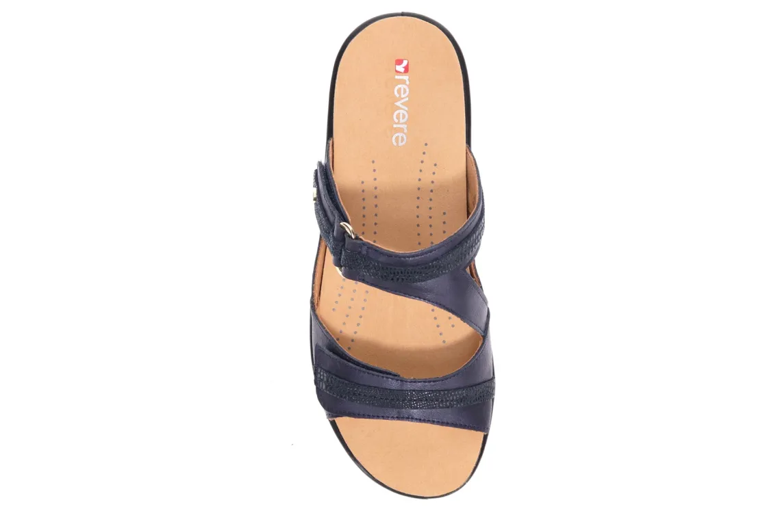 Revere Rio is a comfortable double-strap slide sandal. These warm weather shoes have leather uppers, removable insoles and a sturdy PU midsole and outsole. A contoured microfiber covered footbed, strap extenders and orthotic friendly design makes these sandals stand out.