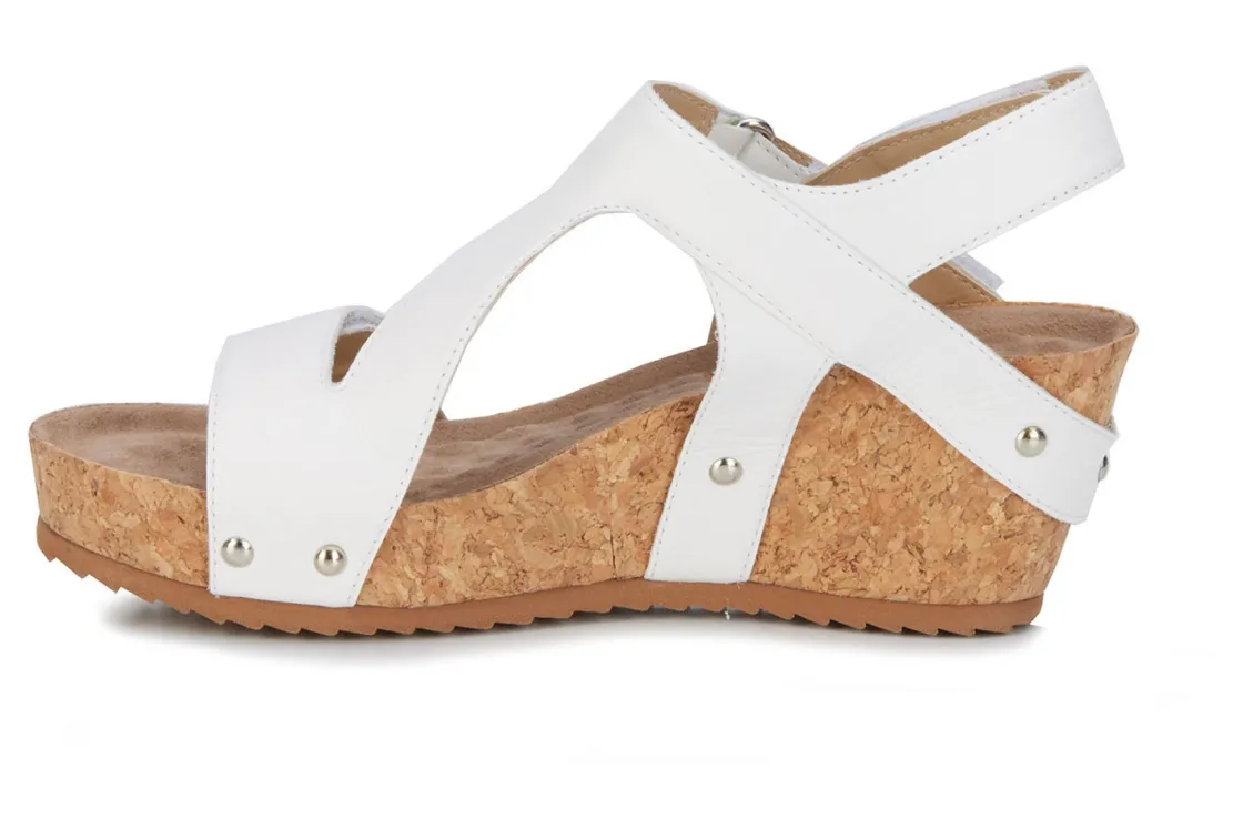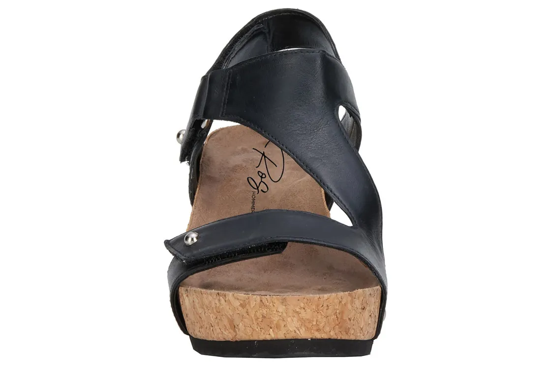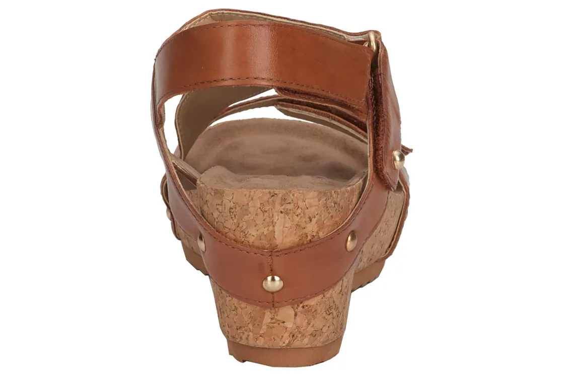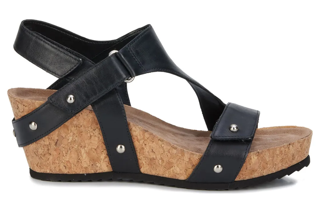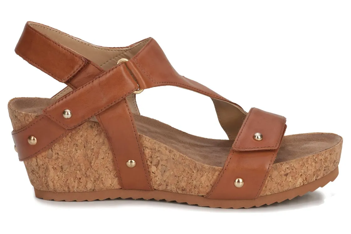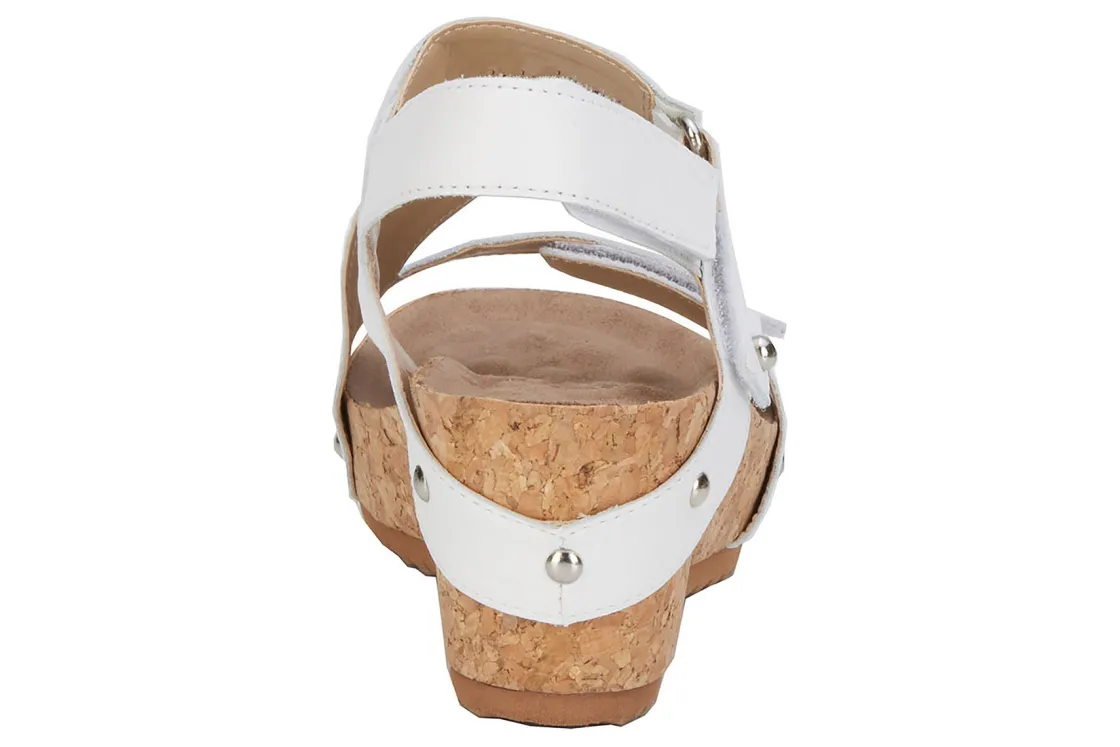 Ros gives you complete adjustability is with Traci. Three leather straps are secured with hidden hook and loop closures. Lovely nail heads accentuate the leather straps where they wrap over the cork covered wedge heel. Cushioned Tiny Pillows insoles within the contoured footbed provides extreme comfort , making Traci your go-to summer sandal!