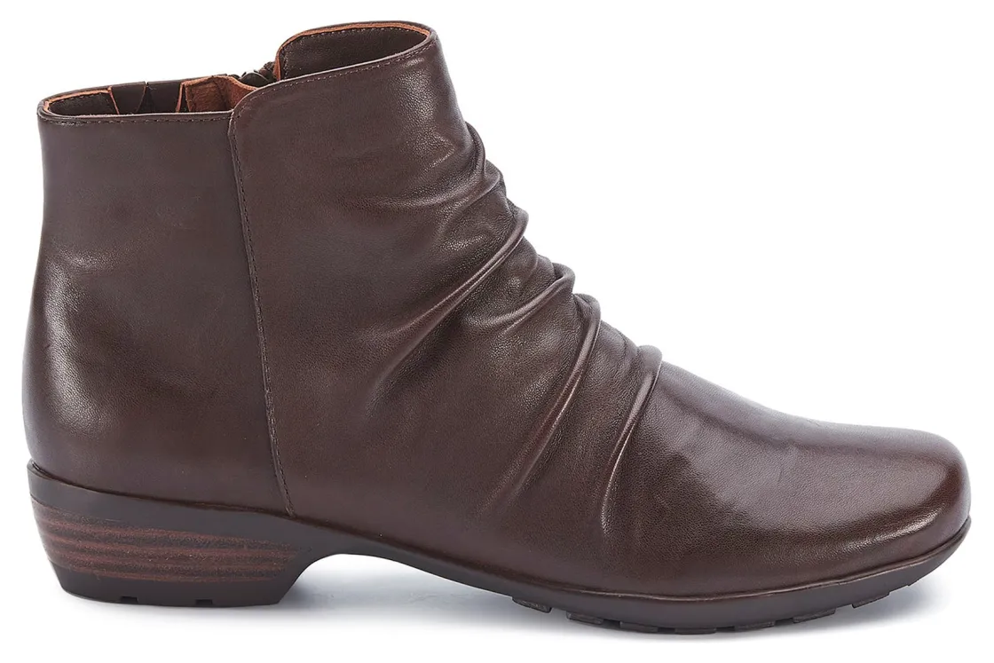 Booties are a fall essential to every wardrobe and Esme by Ros is a standout choice. Featuring beautiful leather or soft suede and ruched detailing on the vamp, an inside zipper makes it easy to get on and off, while discreet gore near the zipper allows flexibility around the ankle. A roomy, walled toe box provides plenty of space for your toes. Signature Tiny Pillows insoles feel amazing with every step you take! The stacked-look heel is just the right height for keeping your heels pain-free.