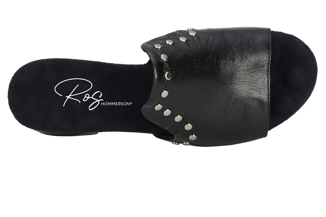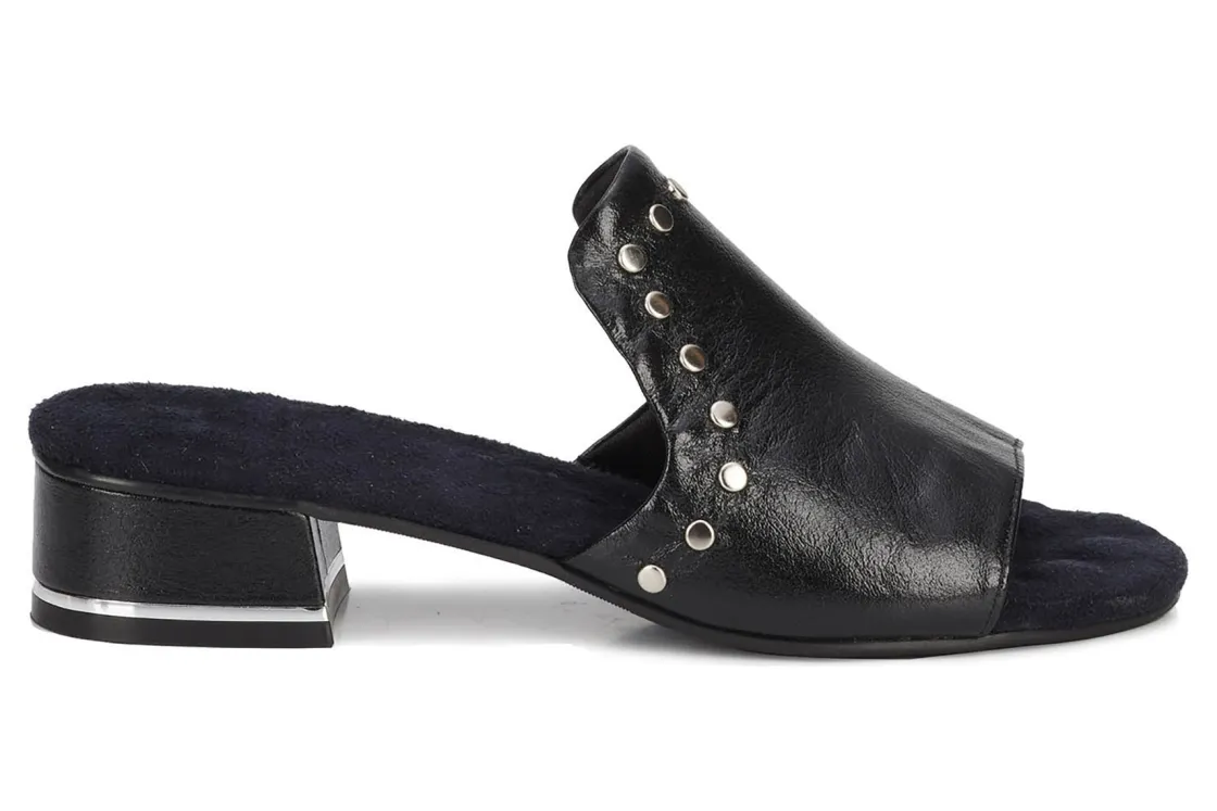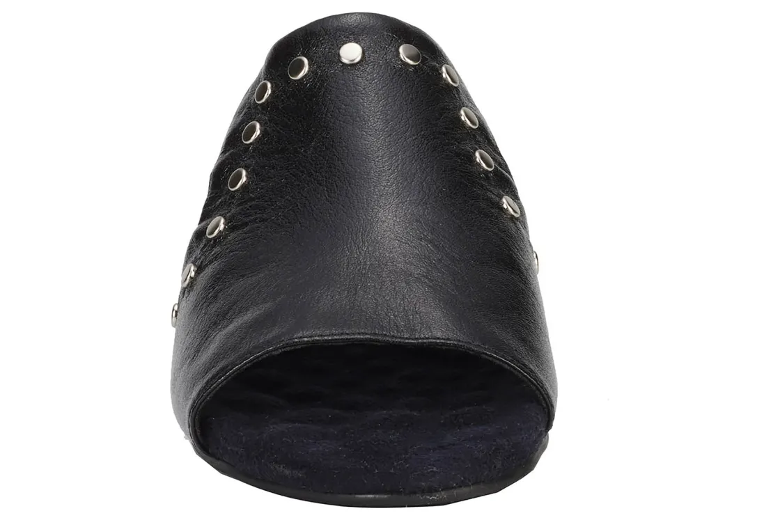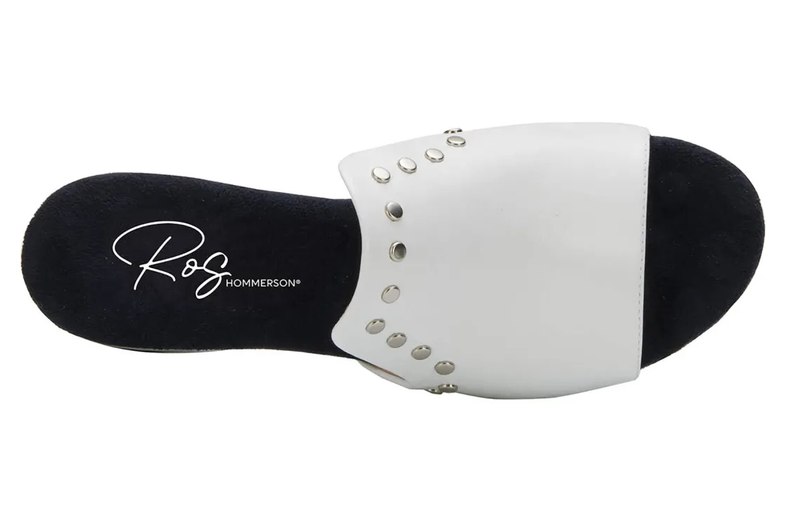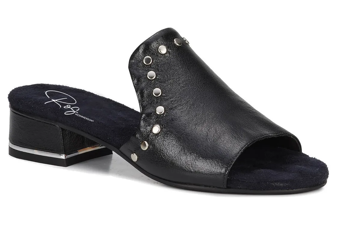 This easy slip-on sandal by Ros gives a luxurious vibe to your spring and summer wardrobe. Made from soft leather, Bizzy is accentuated by metallic nail heads and heel detail. A discreet instep gore allows flexibility when walking while cushioned pillowy footbed with moderate arch support make every step a dream!