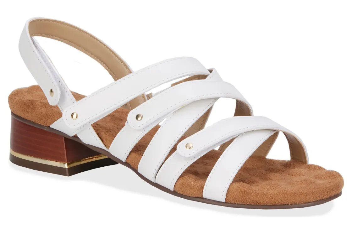 Comfort, adjustability and pizzazz all in one! Breeze into summer with this strappy sandal from Ros that includes four completely adjustable hook and loop closure straps, one discreetly elasticized strap, and set off with metallic nail heads and heel detail. Signature Tiny Pillows insoles are both cushioned and pillowy with moderate arch support, making every step a dream!