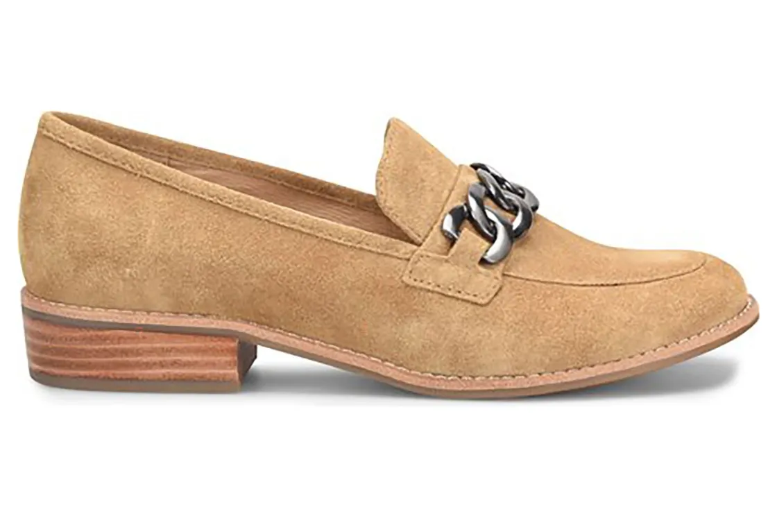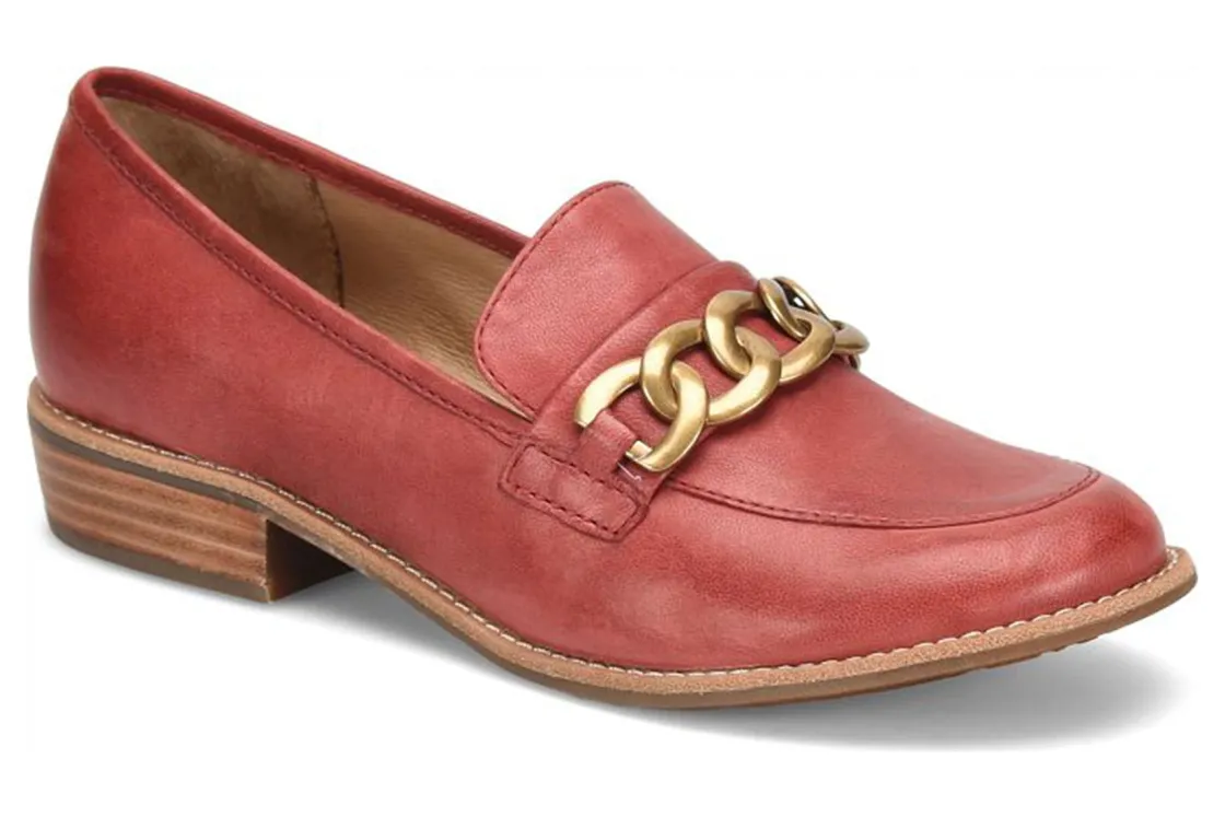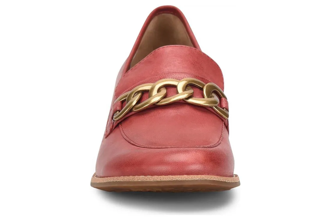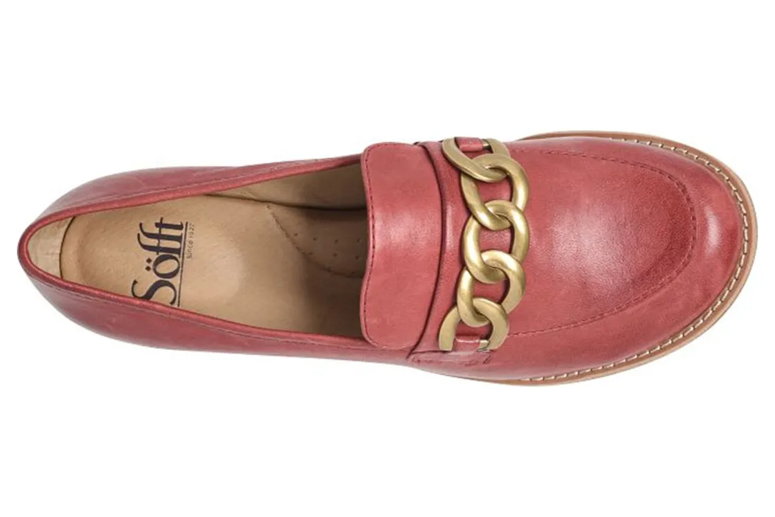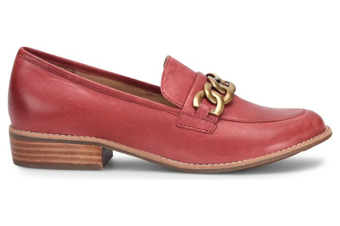 Sofft Nevara is a trendy and comfortable loafer. Smooth leather uppers support feet, chain link ornament adds elegance and cushioned footbed provides comfort. A lightweight and flexible TPR outsole and leather stacked 1 ¼ inch heel completes these loafers.