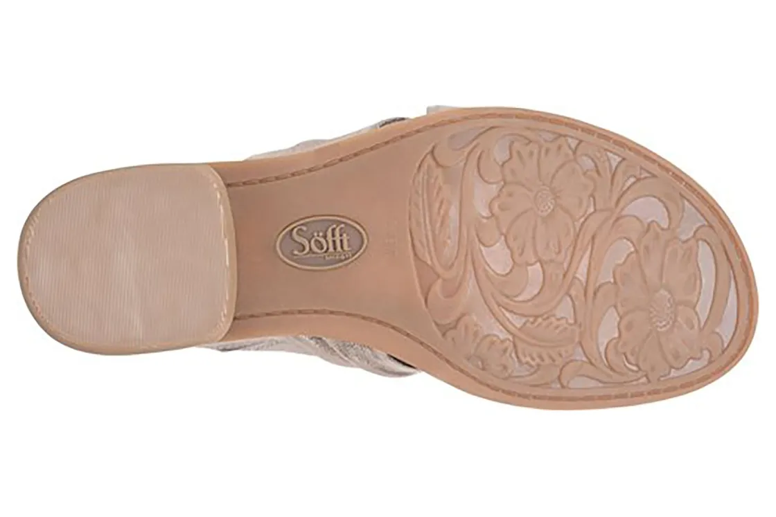 Sofft Fallon is a stylish and comfortable slide sandal. These spring and summer shoes have Italian leather uppers, a cushioned footbed and a slip-resistant TPR outsole.