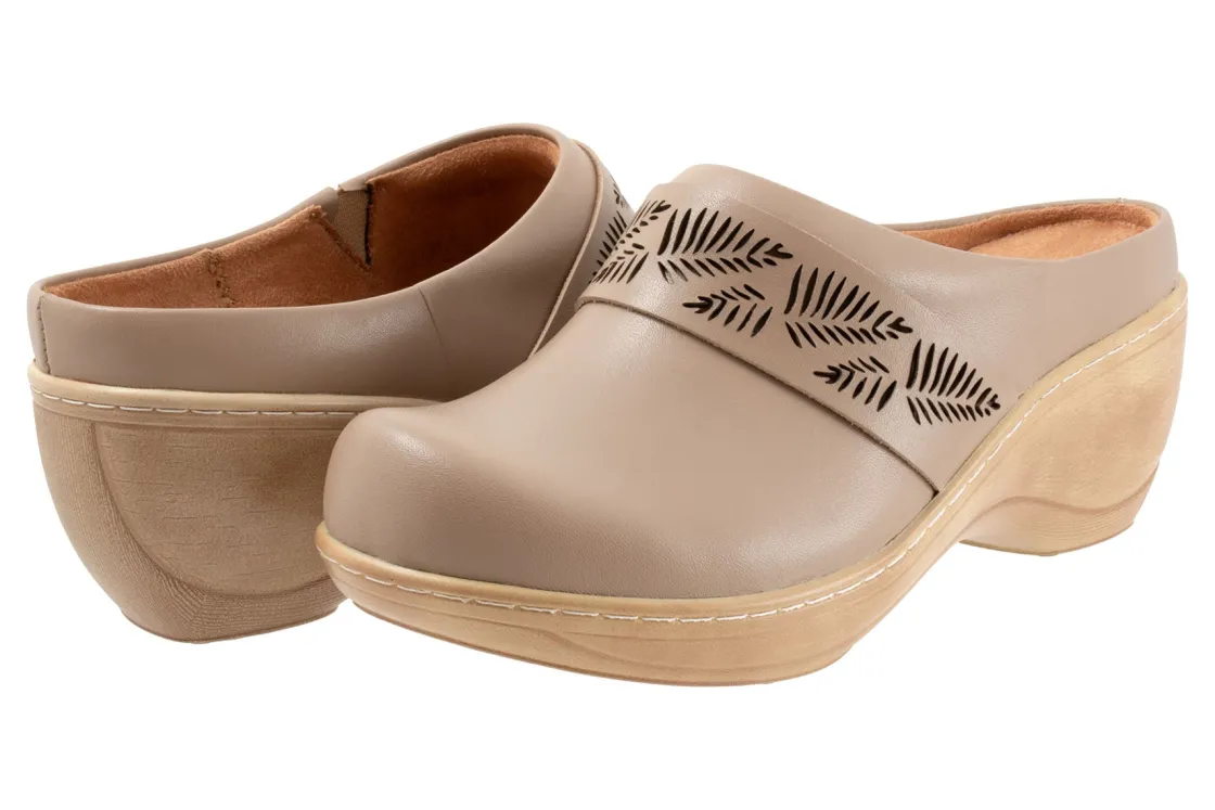 A leaf pattern cut into a band across the Melita adds a cute design element to the lovely Melita clog. The Melita clog has a soft removable footbed with arch support and is built on our popular curvy lightweight platform wedge.