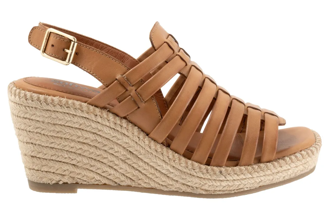 The Softwalk Havana wedge sandal has multiple thin leather bands and a back strap with an adjustable buckle. Hidden elastic goring provides a flexible fit and the artfully braided jute platform is set on a rubber sole.