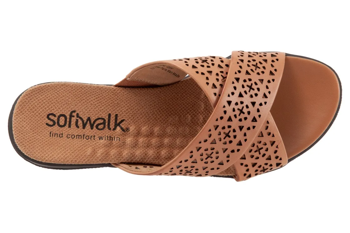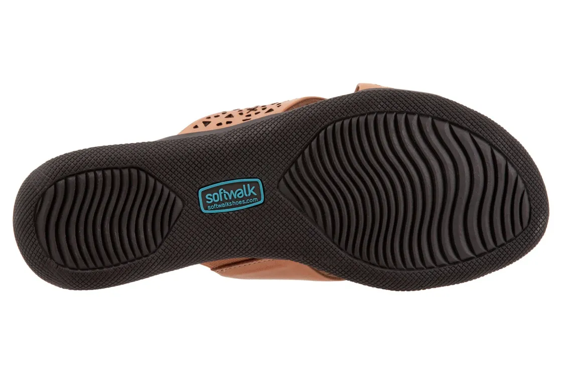 Wide criss cross bands of soft leather define the simple elegance of the Softwalk Tillman slip on sandal. Tiny massage bumps stimulate the sole of the foot for all day comfort. The Tourist sole is super flexible and supportive and slip-resistant treads deliver a sure grip.
